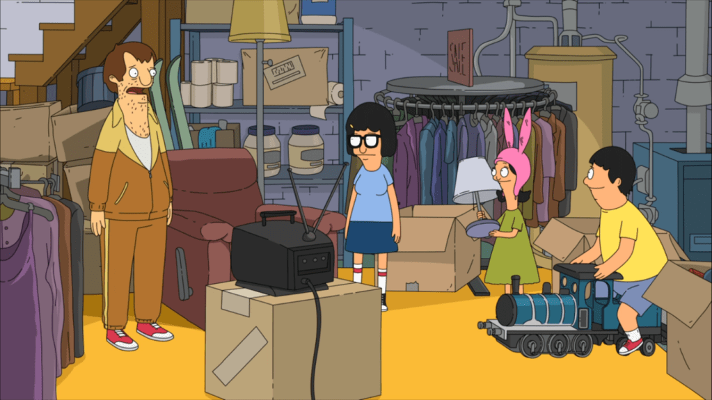 In the Belcher living room, punch has been made and the family is ready for Linda to read the will. The children are clearly expecting a windfall here from their great uncle who owned a furniture store, but Bob tries to reset expectations. Linda does a dramatic reading (of sorts) only to find out they have been left whatever is in some storage unit. The family is slightly deflated, but they have to go check it out for themselves. We cut to the Just Stow It Storage facility where the family has resumed letting their imaginations run wild with optimism. Bob, being a bit of a downer here, reminds them they’ll have to pay taxes on whatever is in the storage unit if it’s any good. He lifts up the door to the unit and everyone gasps to find a dude just chilling inside in a tracksuit amongst a ton of boxes. He says “Oh, hi,” and Gene declares triumphantly “We won a cave man!”