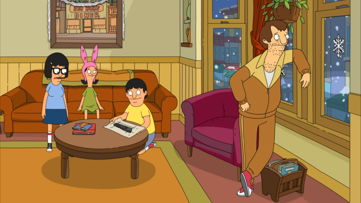 Christmas Day arrives and we’re in the Belcher living room where Linda is declaring that Uncle Ernie’s storage unit had a few treasures in it. Gene opens his gift and thanks Santa for an exit sign. Tina is happy with her shoe sizer while Louise seems thrilled to have a device that removes security tags from merchandise. I can see her getting into some trouble with that as she declares “Next Christmas is on me!” Chet is seated in a lounge chair with Nadine draped across his lap in a sexy Santa outfit. Bob asks what he’s going to do after the new year and Chet just casually remarks he plans to go back to Manhattan. Apparently he owns a loft there which has been in the process of getting renovated. We hear an exasperated Bob shout “WHAT?!” before heading to the credits.
