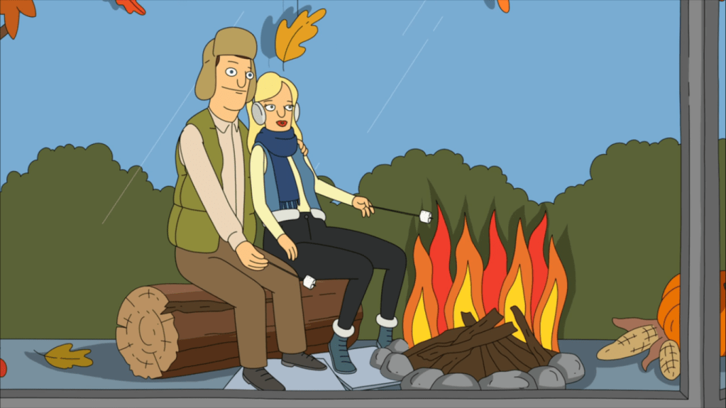 It’s now time to hear Chet’s origin story. He was a mannequin in a sports store and Nadine was too. She didn’t have any nipples and she didn’t need them, per Chet. As the seasons (and fashion) changed from summer to fall casual their relationship became anything but. Chet remarks that one day he took Nadine skiing and we’re shown that they were just covered in skiing attire. An accident happened, a clerk knocked Nadine over smashing her right hand. She was taken away for repairs and when she came back she had two left hands. Chet then tells the family he had to make an important decision. Gene thinks he means what hand to replace with a hook, but Chet corrects him by saying he had to decide which hand to put a ring on. The two are shown in a wedding display apparently getting married. Gene shares this opinion on the resolution with a “Boo!”