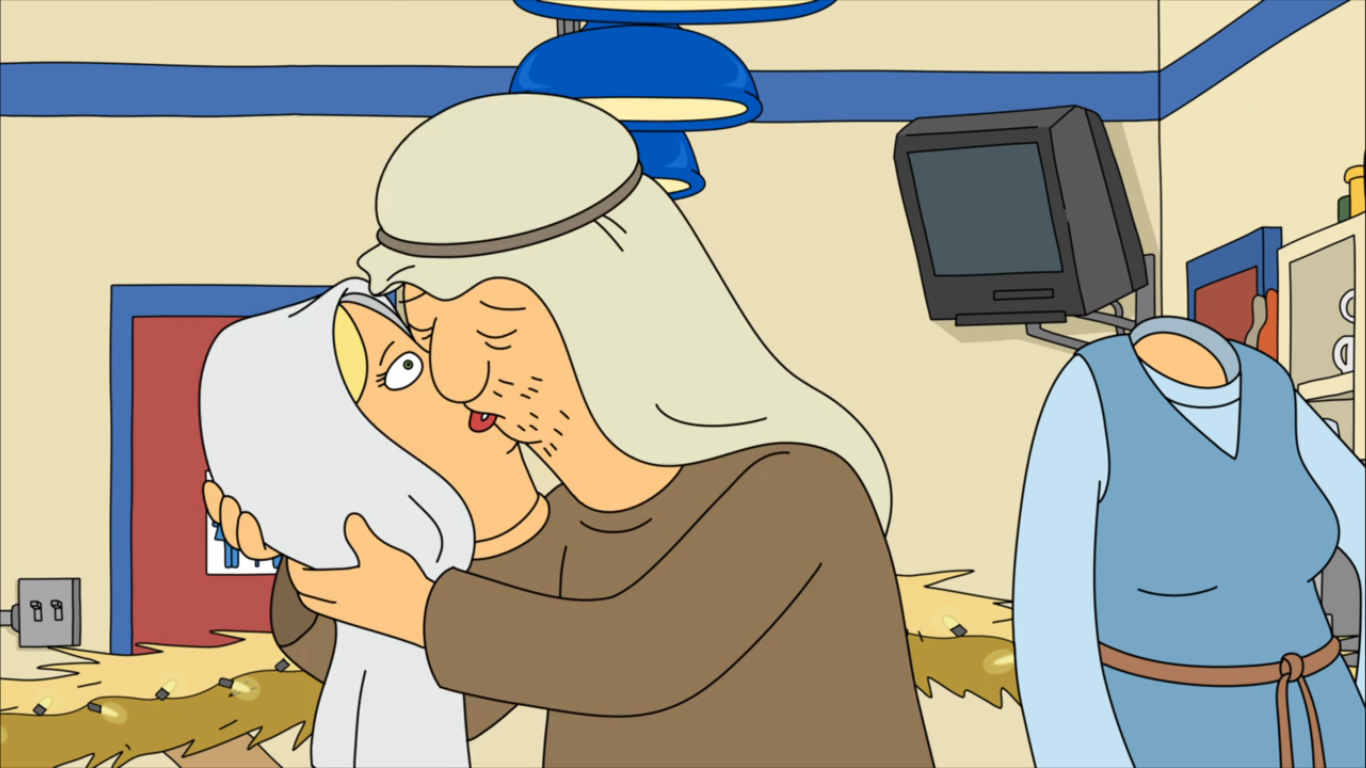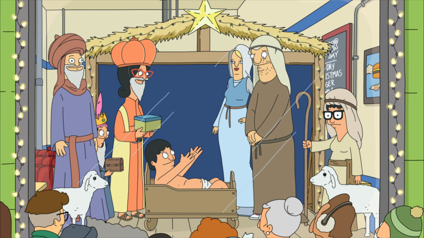We cut to upstairs and we’re apparently going with a nativity scene. Chet is Joseph, Nadine is Mary, Tina, Linda, and Louise are kings and Gene is baby Jesus. Chet gives a brief pep talk concluding with “Aaaand no action!” Hah, mannequin humor. Bob heads outside to present the display which goes over well. Mort’s mom is present and remarks it was worth the wait. Teddy offers to take a picture of Mort and his mother and tells Mort to fix the wig. Mort thinks he was referring to the rug on his head, but Teddy informs him he was referring to Mort’s mother who has a weird, pointy, thing going on.