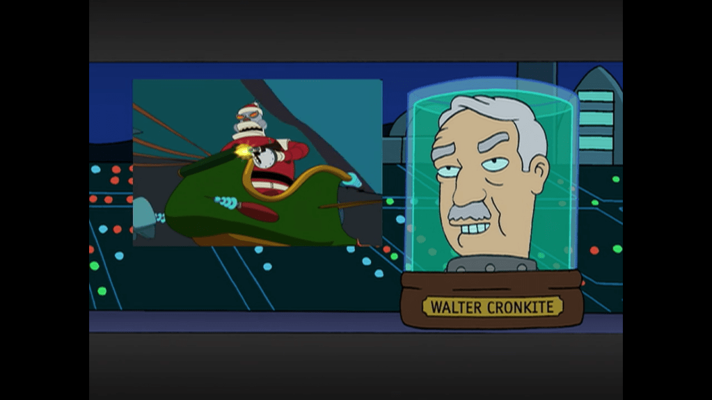 It’s now time to hear a holiday message from the head of Walter Cronkite (Frank Welker). He is here to offer up a warning about Santa Claus. As he details the danger this menace presents, we’re treated to images of the robot’s exploits from the prior episode. The message is concluded with Cronkite telling the viewer, “Remember, I told you so.” And as he finishes, the screen gets covered by planks of wood. Hermes (Phil LaMarr) is apparently pretty frightened by the prospect of Santa to the point where he feels the need to cover the television. Fry is fine with it since he’s tired of this wood show. We cut to the crew trying in vain to install the fireplace cover to keep Santa at bay. The Professor (West) is there to scold them for taking too long saying he only has a few years left to live and doesn’t want to spend them dead! Leela (Katey Sagal) encourages Fry and Bender (John DiMaggio) to push harder prompting Bender to say, “Oh? Push!” Once the robot is pushing instead of pulling the giant shield slams into place causing Fry and Leela to get tossed aside.