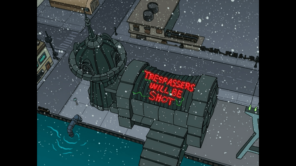 With the shield in place, the Professor seems no happier. Declaring they’re doomed, he takes a seat and remarks he’s thankful that he installed some blast shields for shutters. He presses a button on the chair and we see his idea of defensive shutters are more like the shields on the 1989 Batmobile. Steel plats cover the entirety of the Planet Express building. Unfortunately for Amy (Lauren Tom), no one told her the Professor was going to be activating them as she was busy boarding up the windows. The blast shields knock her off of her ladder. There were no survivors. Actually, she’s fine, I just couldn’t resist going back to Morbo for a second. Once the shields are in place, we can also see the Professor’s holiday greeting spelled out in Xmas lights on the roof of the building: Trespassers Will Be Shot.