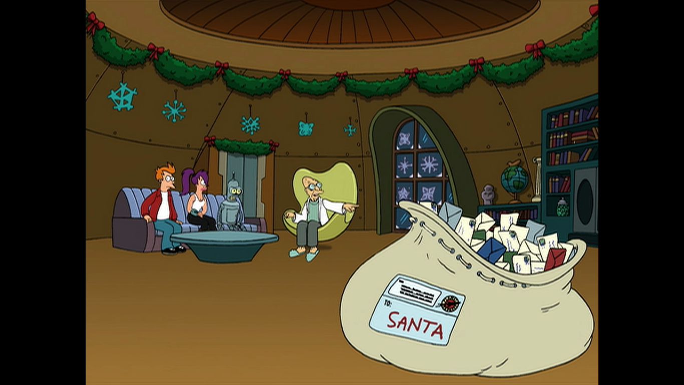 Santa is interrupted by the elves delivering the sack of letters. Santa is angry they failed to knock reminding them he could have been watching something really naughty on his device (“I get New Orleans on this thing!”). The elves, clearly terrified, apologize and run off before Santa can say anything else. Inside the letter sack, Leela informs the others of her plan to confuse Santa with a logical paradox and issues a warning to Bender. The three emerge from the sack and Santa is understandably surprised. He whips out a very large gun preparing to blow them away, but surprisingly responds in kind when Leela asks him to stop. He listens as she introduces her paradox (while Bender covers his ears and hops up and down) which claims that Santa is designed to punish the naughty, but is too naughty, and therefore he should have to destroy himself. The robot’s head begins to smoke and spin before finally exploding. Wow, that was easy. Why didn’t anyone think of that before?