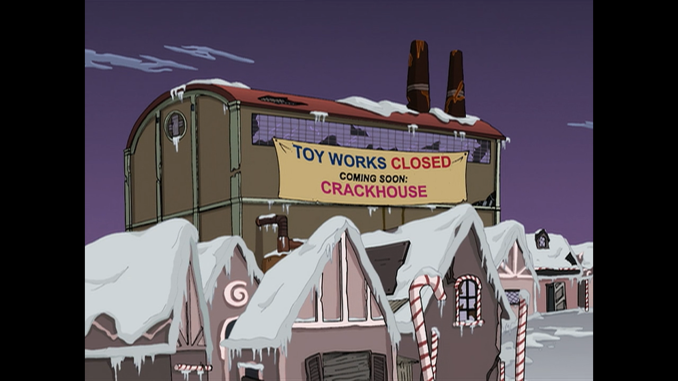 As the gang walks through Jolly Junction we get to see how the elves live. It’s not pretty. Some are being massacred by wolves while another pair is trying to stab each other with broken bottles. When the crew walks past a house with two Neptunians each holding a baby (the babies are in turn holding hands) they beg for any morsel of food that they could provide. When Fry points out that they live in a gingerbread house, one of the elves retorts “Hey! It’s food or shelter – not both.” Fair enough. Bender calls them lazy and assumes that they should have money from all of the toy making that goes on. Just the mention of toys causes all of the elves within earshot to gasp and raise their heads. A helpful one points out that the toy factory has been closed for years since Santa judges everyone to be naughty. We see the closed toy shop which has a “Coming Soon: Crack House” banner on it. Fry has his blood angried up at this and vows to shove his foot up Santa’s chimney! He informs the elves that he just needs directions on how to get into Santa’s ice fortress. The first elf to greet them volunteers and his companion takes one look at their hands which are joined together and remarks, “Aww, phooey!”
