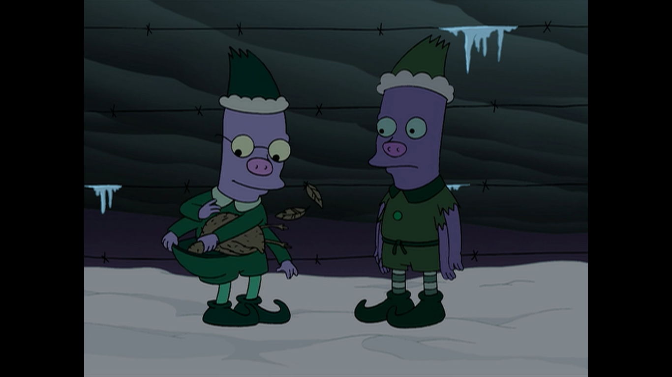 Fry is dismayed at all of these letters. Xmas was a time for bringing families together in the 20th century and he wants to bring that kind of Xmas back for the people of this era. Bender questions who would be willing to do such a thing and Fry confirms that they are! Leela is in agreement as the ship speeds towards the north pole of Neptune. Upon landing, we meet the Neptunians of Jolly Junction which looks more like a war zone than a happy, Santa, village as the sound of gunfire and barking dogs fills the air. The Neptunians are dressed like elves and seem to always come in pairs which are always holding hands. A welcome party, as Leela dubs it, comes over to greet them. The first one (West) offers to sell them a kidney while his companion (David Herman) invites Fry to punch him for a buck. Leela refers to them as elves which is when they explain they’re Neptunians (I think Elzar is one too, a four-armed alien race, basically) that are just small because Santa doesn’t feed them. His companion then grabs Fry’s hand and makes him slap him demanding a dollar in return.