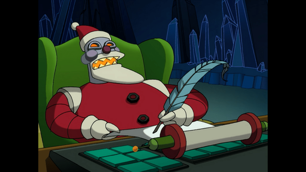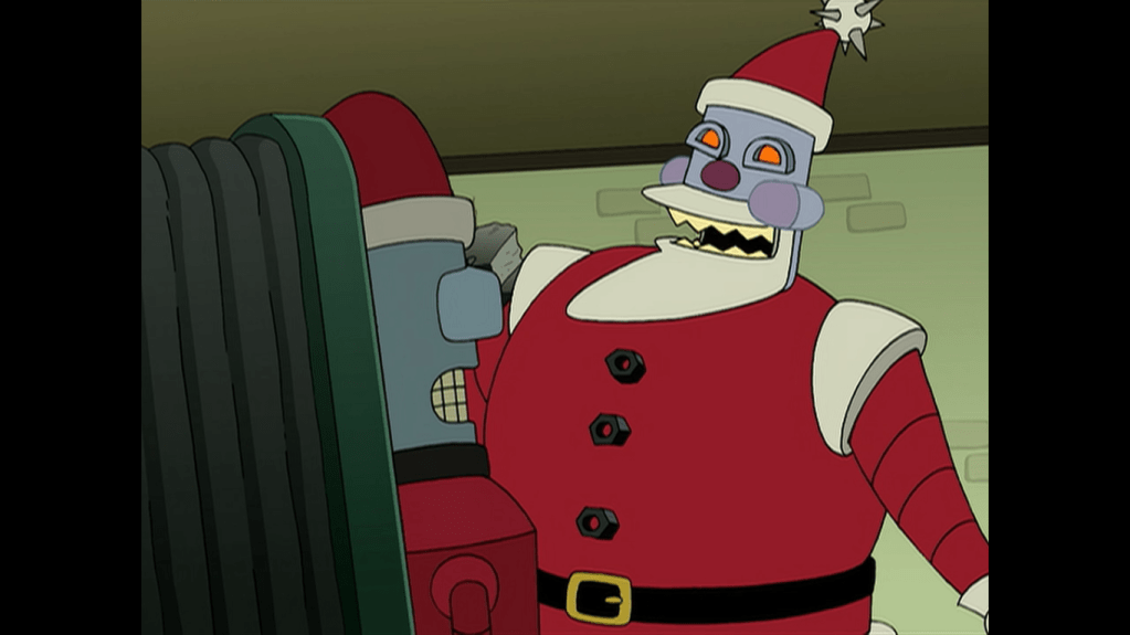“Xmas Story” is our introduction to Christmas in the year 3000. Philip J. Fry (Billy West), the time-displaced protagonist of the series, gets to learn how much Christmas has changed over a thousand years and we, the viewer, get to experience the same. Turns out, a robotic Santa Claus had been invented several decades prior to that story which went crazy. Its standards for niceness were too high and thus everyone was deemed naughty. Santa, apparently no longer content to hand out coal to naughty children, decided that it would prefer to kill the naughty instead making Christmas one of the worst days of the year.