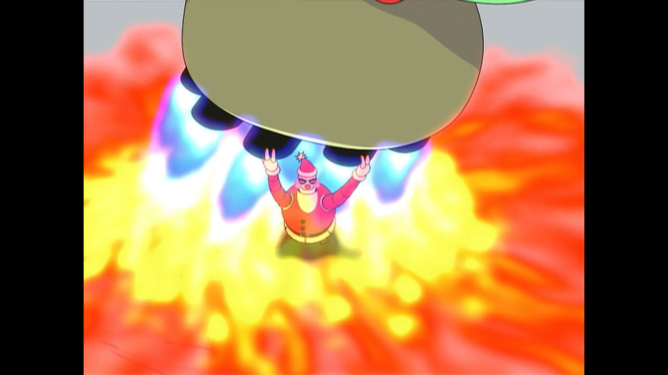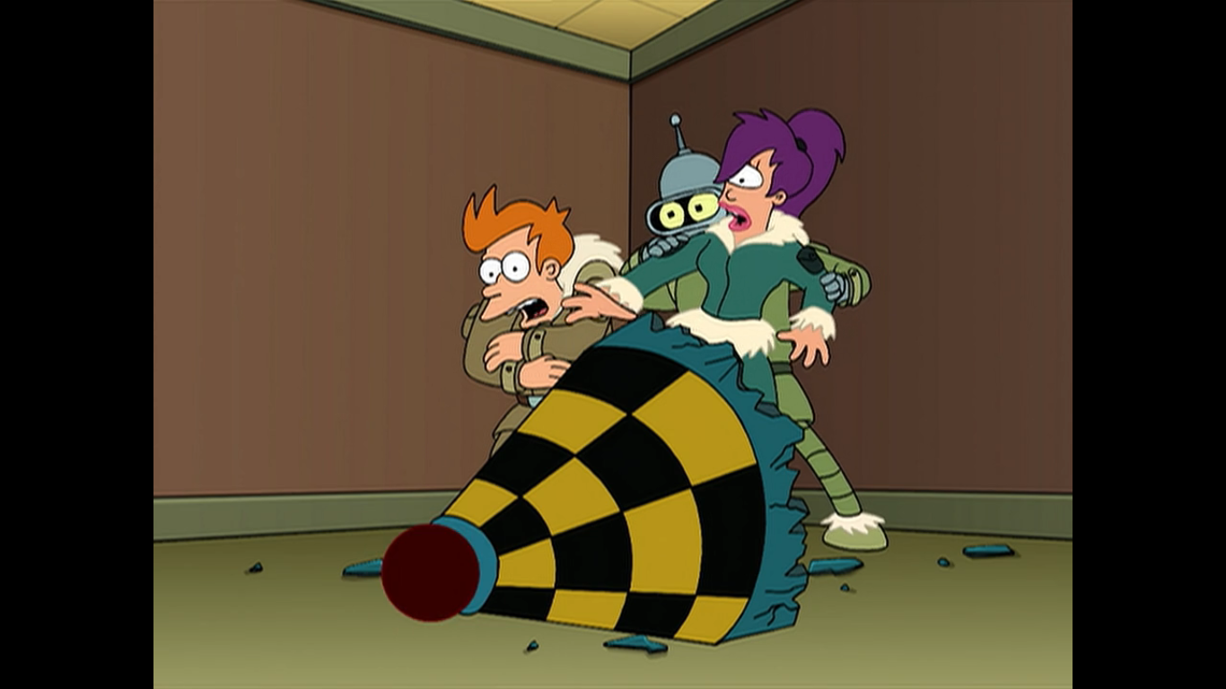Because Santa had a head built with paradox absorbing crumple zones – that’s why! A new head just pops up to take the old one’s place forcing Fry and Leela to bail. Bender, because he was covering his ears, is a bit slow to pick up on what’s going on, but upon seeing Santa pointing his massive bazooka his way he gets the right idea to run. Santa fires as the trio duck into an elevator and the doors close right on the missile. It’s stuck there, blinking and beeping, while the elevator goes down. The tip of the warhead gets cut off, but we soon see Fry, Bender, and Leela emerging from the elevator at the base of the mountain, only Leela is carrying the explosive for some reason. She pauses, remarks “Wait! This is what we’re running from!” then tosses it back into the elevator. Fry hops onto a toboggan with Bender behind and Leela in the rear. They just sit in place with Fry shouting “Faster! Faster!” The bomb in the elevator then explodes and the force of the explosion sends the crew shooting down the mountainside.