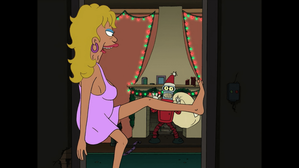 It’s time to check-in on the rest of the Planet Express crew at their headquarters. Amy, looking no worse for ware following her earlier accident, is using a jetpack to spray Xmas lights onto the traditional Xmas tree. They come out of a can like silly string. Leela is decorating a bush with candy canes which Nibbler promptly eats off. Fry has moved an old-fashioned clawed bathtub into the living room to make eggnog in – just liked Grandma used to drink (even though in the prior Xmas episode we found out his idea of eggnog was just bourbon and ice cubes)! Hermes looks on as Fry tastes it immediately spitting it out declaring it’s gone sour. Zoidberg (West) then emerges from the nog requesting privacy while he takes a scented bath. Leela is at the side of the Professor’s chair reminding him that Bender is Santa so they don’t have to hurt him. He angrily shouts back at her “Yes! Yes! Yes! You sound like a broken mp3!” and waves her off.