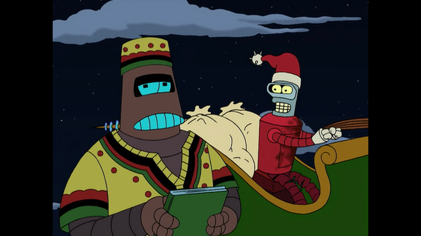 We next catch Bender flying in the sleigh his body reflecting the punishment he has endured this evening. He is soon approached by Kwanzaa-bot (Coolio) who is in some sort of rocket powered canoe. He’s alarmed to see “Kringle,” as he calls him, in such a sorry state, and Bender just bemoans the fact that everyone hates him. Kwanzaa-bot counters with an at least everyone understands you. Bender asks if he wouldn’t mind helping him out with these toys, but Kwanzaa-bot has his own work to do tonight: handing out the traditional Kwanzaa book “What the Hell is Kwanza?(sic)” Kwanzaa-bot then hangs his head and sighs, “I’ve been giving these out for 647 years.”