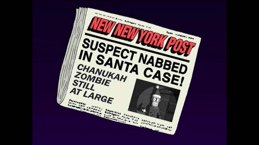 With the toys “delivered,” Bender ducks into an alley to unscrew his present – a bottle of booze. As he enjoys it, New New York’s finest beat cops Smitty (West) and URL (DiMaggio) happen upon him. They both reason that bagging Santa on Xmas Eve would do wonders for their careers, earning URL a promotion and getting Smitty back onto the force (he’s apparently not an actual cop in this moment). They approach Santa Bender who looks alarmed to see them. There’s no struggle, apparently, as there’s a camera shutter and then a copy of the New New York Post is superimposed on the screen with a picture of Bender and the headline “Suspect Nabbed in Santa Case!” And below that, “Chanukah Zombie Still at Large.”