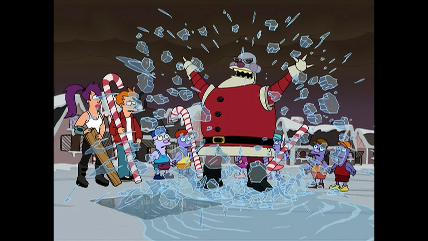 Fry and Leela apparently aren’t going to give up without a fight. We find them on Neptune where the elves are dressed in summer casual attire and happy to see the two return. Leela doesn’t care about them though as they’re here for one thing and one thing only: Santa. Leela reasons that if they return to Earth with the real Santa the courts will have to spare Bender. She uses a chainsaw to free him from the ice while still leaving him stuck in a cube. Santa taunts her the whole time over who will get the last “ho.” Once Santa has been extracted, everyone soon realizes that they have a problem. The heat from the factory has caused a greenhouse effect and the cube starts melting immediately. Santa is soon free forcing Fry and Leela to bail on this idea. There’s a brief chase sequence through the toy factory which includes on animation goof where Santa suddenly has his hat back on, even though Bender stole it. He also gets his ass impaled on a toy solider. Fry and Leela reach the ship without much trouble and as they fly away trying to devise another way to free Bender, the camera pans to find Santa clinging to the ship and hitching a ride to Earth.