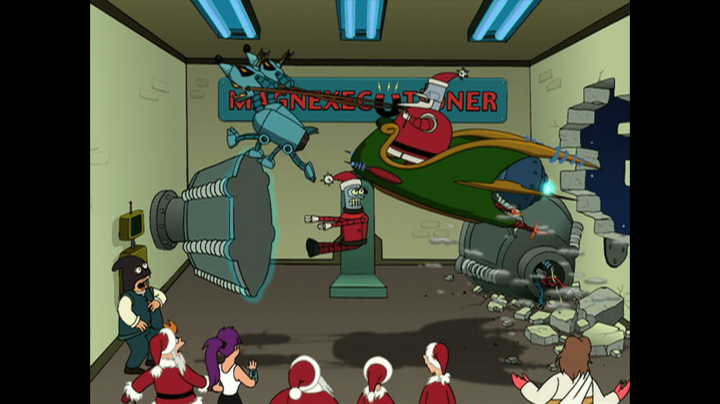 The random number generator then hits zero and the mayor gleefully throws the switch. Bender immediately feels the effects of the magnets, which as you may or may not know, causes Bender to sing folk songs, “Swing low sweet chariot coming forth to carry me home!” Fry can’t bare to see Bender suffer, while the Professor happily points out that at least it’s not boring! At that moment, the real Santa finally comes crashing through the wall in his sleigh. Doing so destroys one of the gigantic magnets though Bender still appears to be in some distress since he is attached to the board he’s on. Santa also has his hat back, so I guess he found a spare somewhere. Santa opens fire on everyone in the room and destroys the other magnet. The mayor cries out to Jesus for help, but Zoidberg informs him that he helps those who help themselves and then makes a retreat.