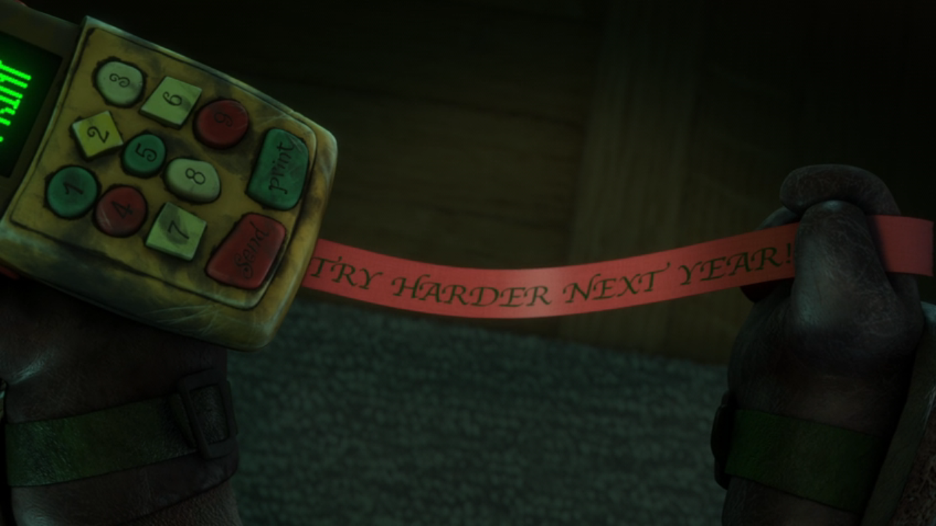 While this melee is taking place, Lanny decides to go for the fruit cake. We see him nervously darting and rolling towards the lair of jinglesmell1337. The kid is seen just sitting in front of their PC as Lanny removes the pin from a sleep grenade and nervously approaches. He spins the chair around and the head of the kid rolls off and to the floor. Lanny thinks he killed the naughty kid, and in his moment of panic basically forgets that he’s holding a live grenade. It goes off with a puff of sparkles in his face as Wayne and Noel come running down the hall. The bedroom door slams shut trapping Lanny inside as he tries to fight off the effects of the grenade. He rises to his feet as a figure approaches. He asks “Jingle Smell?” and the child emerges from the shadows. It’s a girl sporting a pink Disney Princess sweatshirt and a sour expression. Lanny can only look at her say, “but you’re so adorable!” before he passes out.