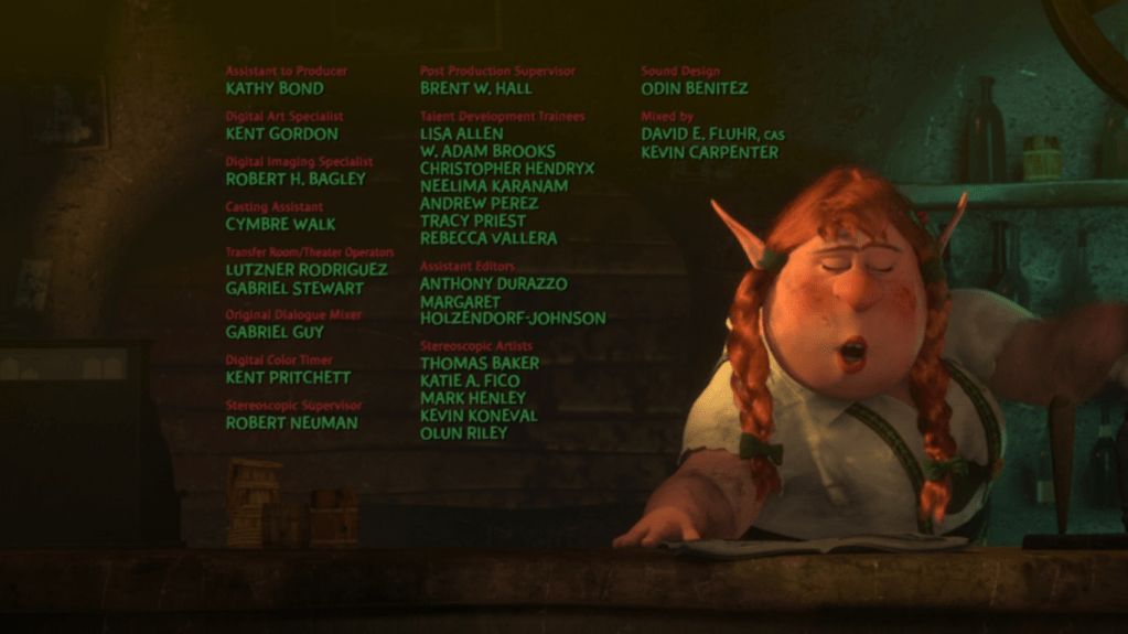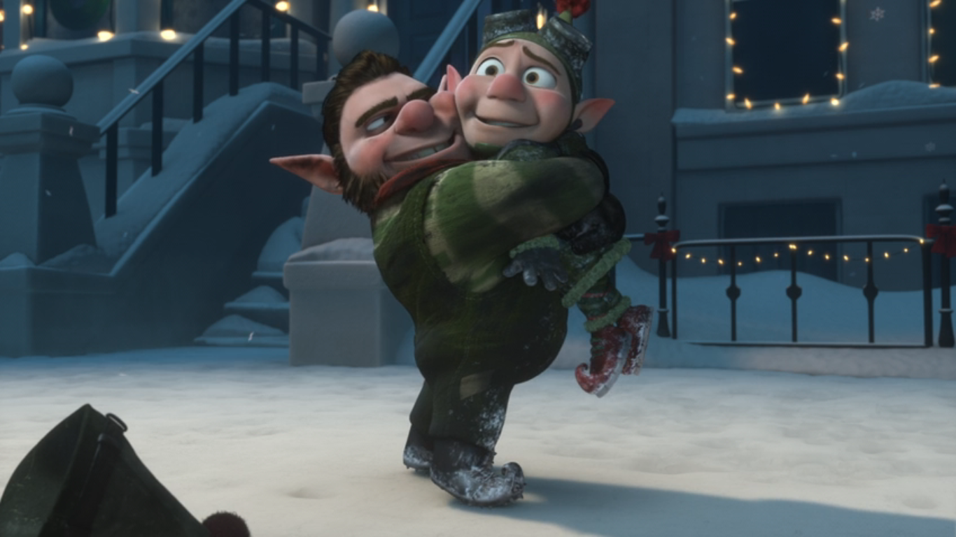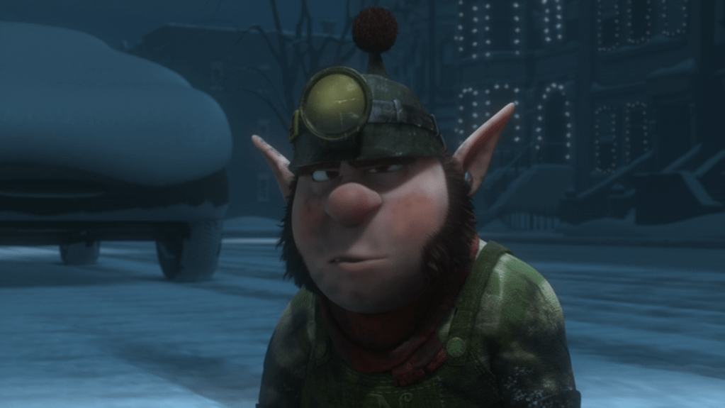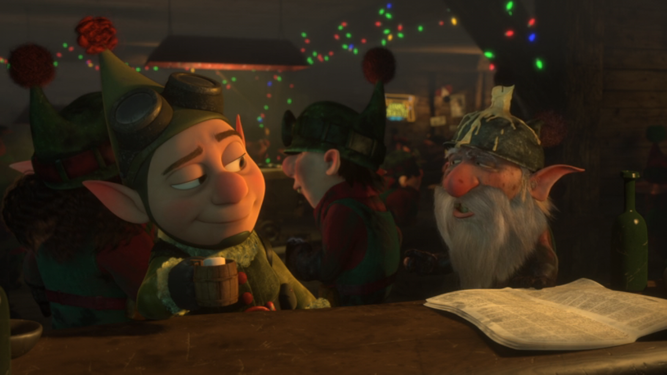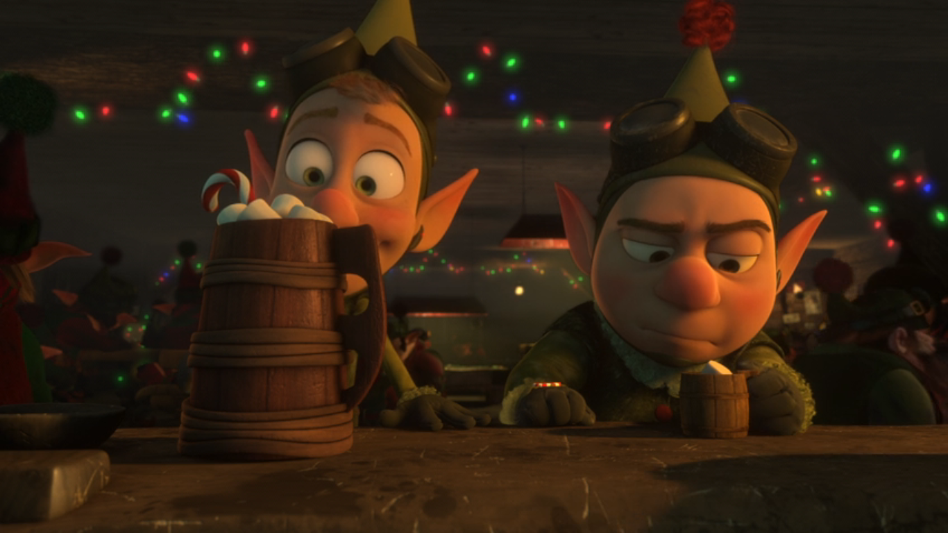 Magee drops the two off in the Coal District and slips in a quick apology towards Wayne before ordering Tiny to floor it. Lanny thinks working with a coal elf is going to be pretty tinsel while Wayne doesn’t see the point. We then head into a coal elf bar. A more rock n’ roll type of song about naughty children (“Naughty Naughty Children (Better Start Actin’ Nice)” by Grace Potter) is played against a backdrop of coal elves shooting pool, tossing axes, and riding a mechanical bull. Because they’re covered in soot, the animation team can get away with making the bar cloudy and smoke-filled like a bar occupied by a bunch of cigar-chomping miscreants. At the bar, Wayne notes that their so-called expert is fifteen minutes late as the bartender delivers their drinks: hot chocolate. Wayne receives a pretty standard sized mug with a single marshmallow while Lanny receives an oversized one with several marshmallows and even some candy canes. He says “Thank you, sir!” as the bartender slides a piece of paper his way. It says Carol and there’s a phone number. Lanny then feels embarrassed as he realizes he just called a woman “Sir” and we finally pan to the bartender who is indeed a rather large, muscled, female elf. She seems unbothered by the slip-up and gives the elf a wink and moves along leaving Lanny to feel rather embarrassed. I say go for it, man.
