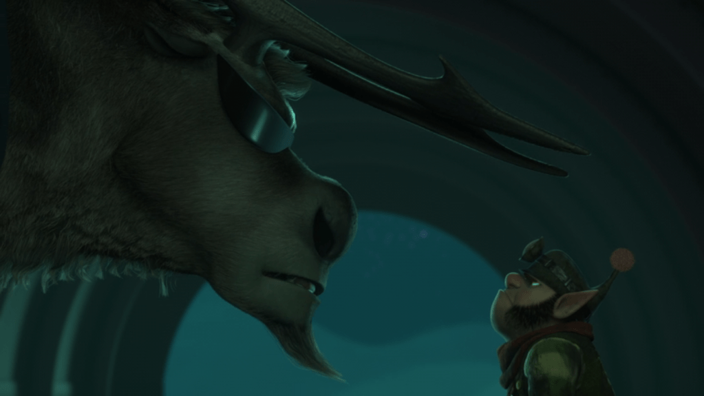 Lanny is understandably shocked to hear that Wayne has a brother as we next catch up with the trio at headquarters. Noel is in a good mood and happy to be finally teaming up with his big brother, who is in fact much smaller in stature than the coal elf, but Wayne does not seem to share in his brother’s enthusiasm. As they approach the hangar where Thrasher (Hayes MacArthur) resides, Wayne warns his brother that the secret reindeer can be pretty irritable and that it’s best he just doesn’t say anything. When he catches a glimpse of Thrasher, Noel’s face hardens. He marches over to him shouting out “Hey! Bambi! I told you if I ever saw you again I’d put your head on my wall!” Thrasher responds with a snort at him and a threat, but when Noel whips out a box of candy canes, the two erupt with laughter. It would seem they’re old friends making Noel one of the few creatures Thrasher actually likes. He does not feel the same way about Wayne.