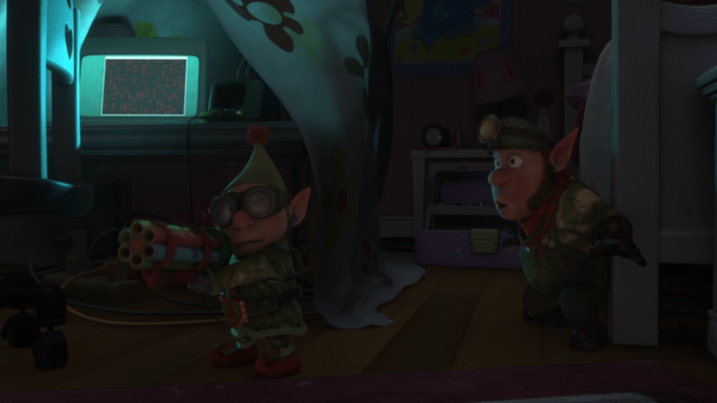 As the elves emerge from the fireplace, one cocks his “gun” like a break-action shotgun, though it more resembles a gatling gun made out of roman candles. The other elf takes out his “fruitcake,” a little handheld device from which the elves communicate and document. They spy a drawing on the wall with crayons on the floor around it and the way the shot is framed it’s like they’re two crime scene investigators coming upon a corpse. Wayne’s voice fills our ears explaining the nature of these two as they spy other elements of naughty behavior including a broken lamp and a bad report card. They document everything and then send it back to HQ via a satellite in space. An elf there reviews the findings and confirms the naughty behavior. A supervisor elf then does the same to check it twice. A naughty rating is then relayed back to the elves via the fruitcake and they print out a ribbon that says “Try harder next year.” It’s affixed to a lump of coal and loaded into a gun which is then fired into one of the stockings.