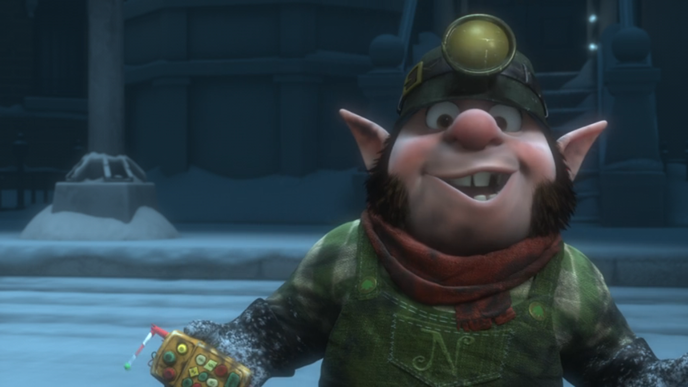 Wayne then looks to his left and sees an old coal elf (the credits would seem to suggest that this is Crumbles, voiced by Phil LaMarr) reading a newspaper. The headline is “Who Will be Elf of the Year?” and Wayne has no inhibition about offering up to the fella that he will be named Elf of the Year. The old guy puts down the paper and appears transfixed as Wayne confirms that he’s THE Prep & Landing guy. The elf has apparently heard of him, but mistakenly calls him Dwayne. He calls out to the other elves that Dwayne from preps and landing is in their presence and that he’s going to be Elf of the Year! Wayne basks in the attention modestly remarking how he’s here to save Christmas and all that while also remarking that their so-called expert is late.