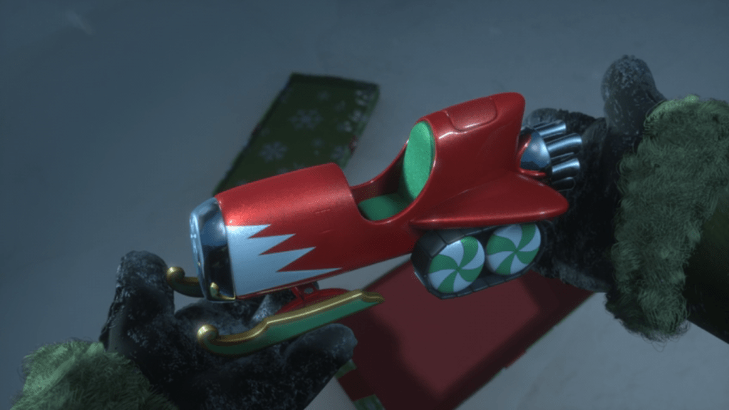 Thistleton does, however, have some good news to relay. It’s looking like this year will produce a record number of names on The Nice List and as he explains we see old pal Timmy Twerlep on said list. He’s getting a football. We also get a glimpse at the assembly line for toy production, though it’s mostly gift wrapping. They have conveyor belts of stuff and tubes to suck up the finished product and deposit them in a massive sack already loaded onto Santa’s sleigh. Suddenly, an image in red flashes across the monitor of one of the elves. The image is unmistakably the child we saw in the opening scene, mask and all, and for a moment the assembly line shuts down. It then resumes operation and the elves mostly shrug it off, all except Thistleton. He has the image on every monitor in front of him seemingly preserved as he narrows his gaze and remarks that someone is being very naughty.