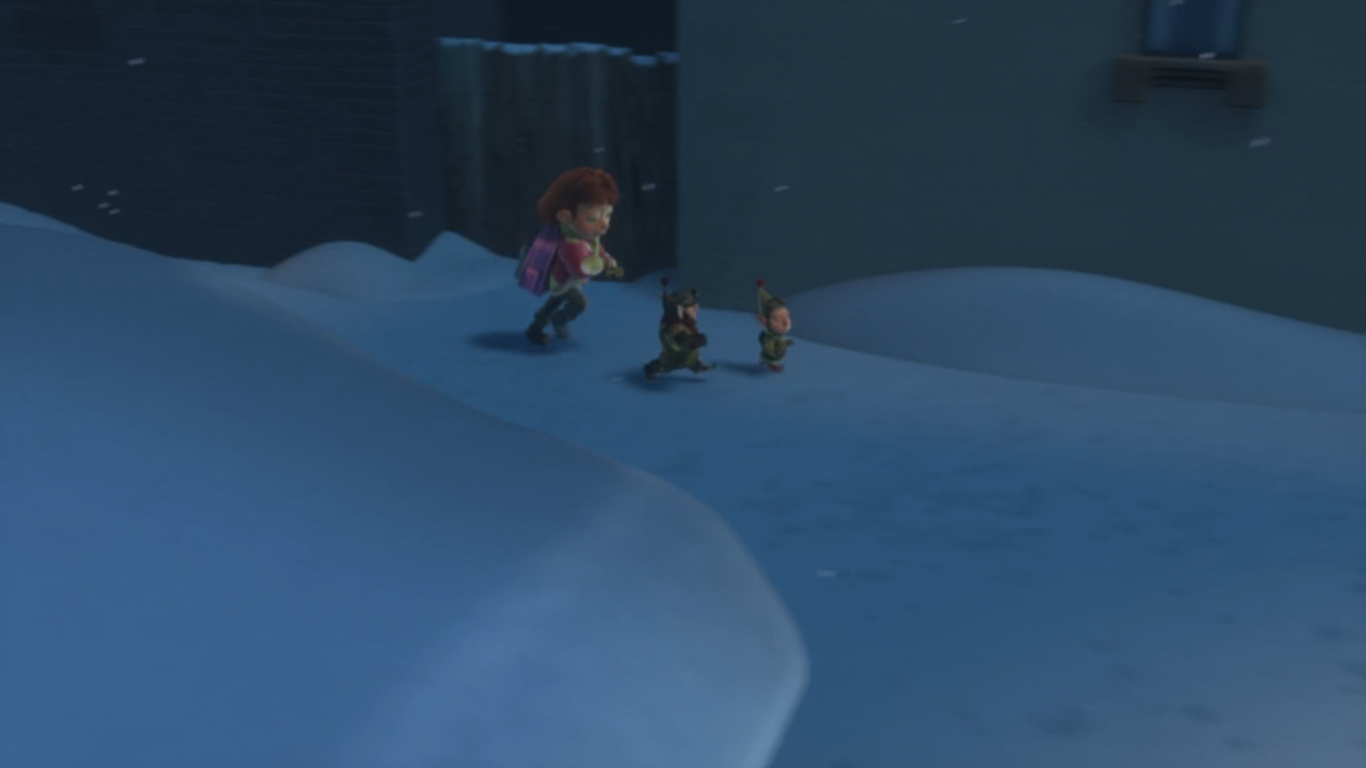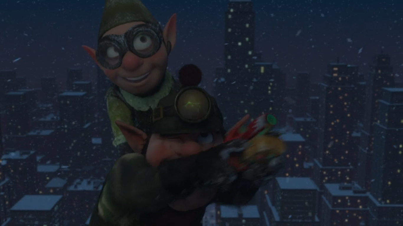 As the crew heads for their target, Noel is teaching Lanny how to properly utter a “Jingle Bam!” of his own. He’s having some trouble, but Noel encourages him to keep at it. He then takes a seat by Wayne who is reading a brochure for snow mobiles since he needs to find a new one. Noel informs Lanny that he was Wayne’s original partner, though not in Prep & Landing. We see a flashback of Wayne and Noel playing superheroes as kids. Wayne was Captain Avalanche and Noel was his sidekick Snowball. The flashback is shown like an old 8mm film and it’s a nice effect as we see the two playing to Noel’s narration. He then brings up a toy associated with the product, the Commander Avalanche Super Sled, and how Wayne wanted it so bad, but that Peterson kid (Peterson was also the elf who got the promotion Wayne wanted in the first Prep & Landing) got it instead. Wayne was enjoying the flashback until Noel got to that part and he especially doesn’t like Noel bringing up how he cried like a baby when he didn’t get that toy. Noel sighs wistfully as he says “My big brother, the big baby.”