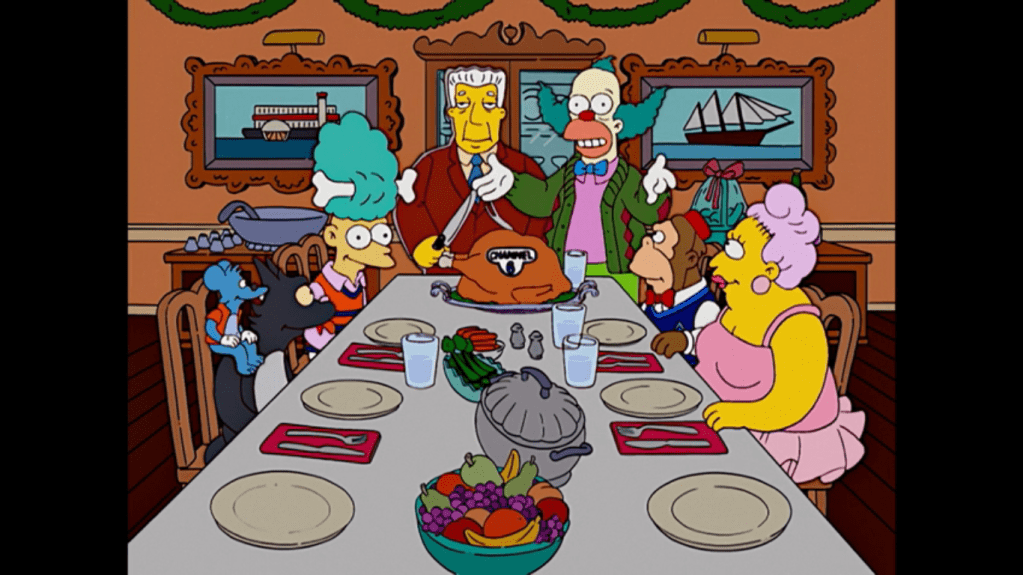 This holiday episode of The Simpsons begins with the standard, abbreviated, opening where we just jump right to Marge almost running Homer over in the driveway. The couch gag isn’t even holiday themed, it’s anime, which is a surprise. We’re not off to a good start here. The episode proper then begins not with Christmas, but Thanksgiving. The family is watching a Channel 6 holiday broadcast featuring Krusty (Castellaneta), Sideshow Mel (Castellaneta), Mr. Teeny, and a large woman dressed as a ballerina. Am I supposed to know who she is? Kent Brockman is appearing via cardboard cutout which Krusty informs us he’s contractually allowed to do because he’s in rehab. Again. Oh, and Itchy and Scratchy are present too which is really confusing. Are they someone in costume? Are they animation and we can’t tell because the whole show is animated? Anyway, Krusty informs the viewers for every dollar spent on Krusty merchandise he’ll be nice to a sick kid. And that hookers with a cold count as sick kids. Never change, Krusty.