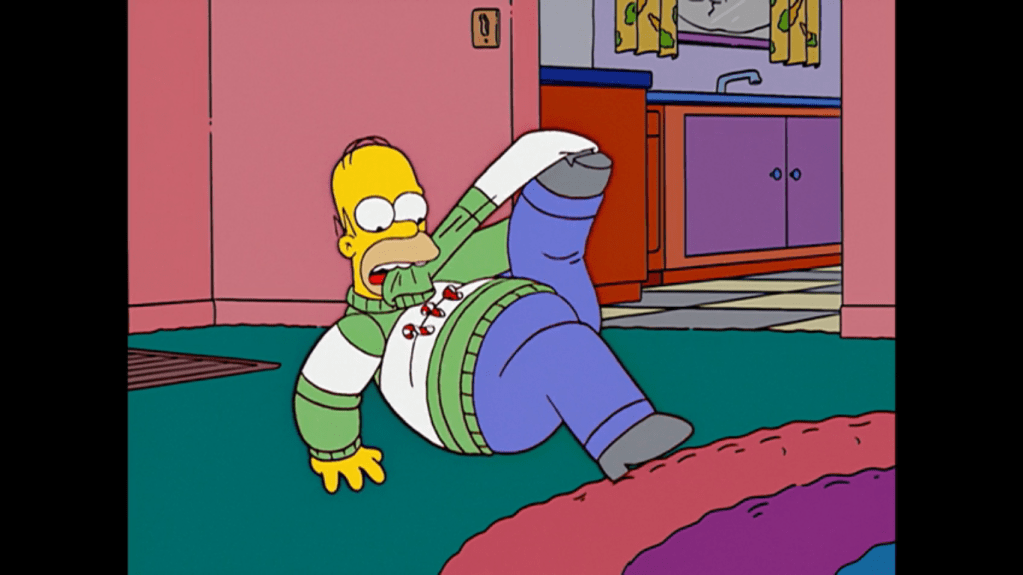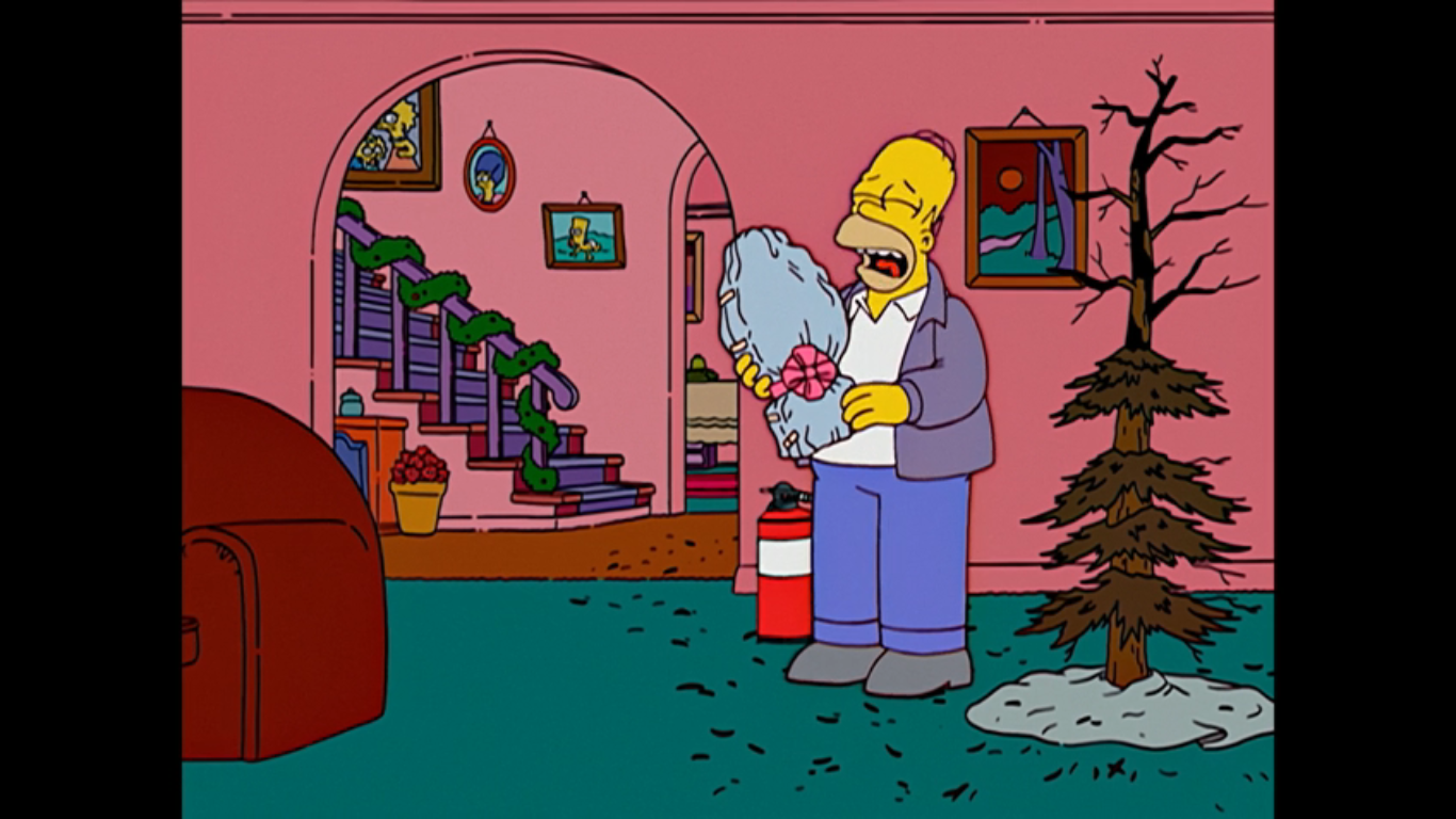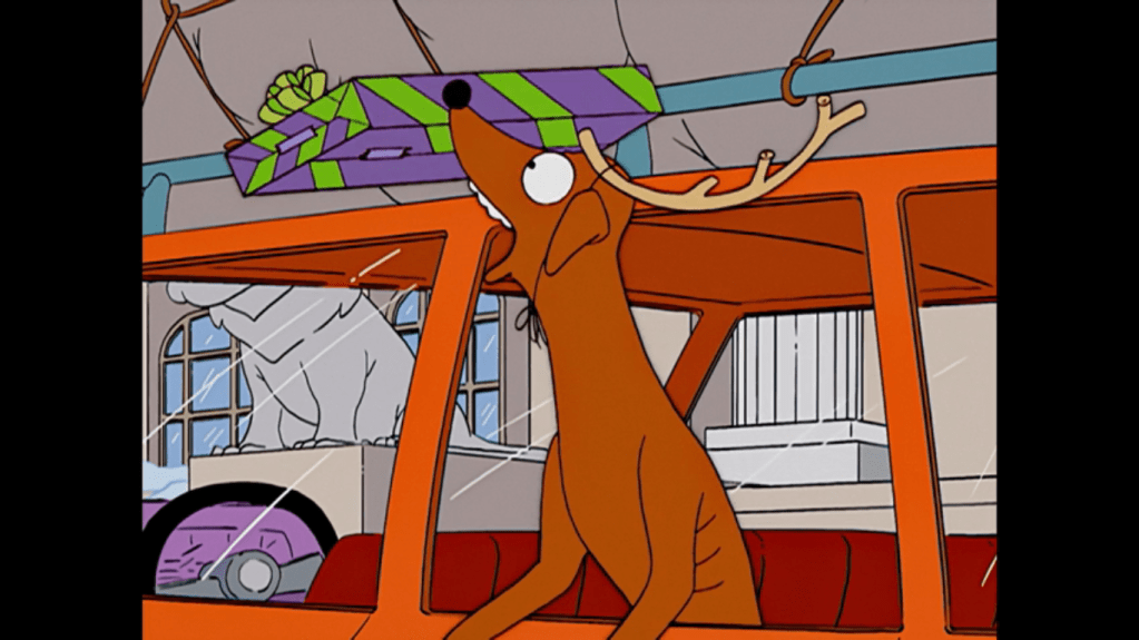 It’s now time for Christmas decorating, and set to “It’s the Most Wonderful Time of the Year,” we see Homer and the kids putting up the decorations. Bart and Lisa (Yeardley Smith) twirl some string lights like a lasso and fling them on the bushes outside. Homer tries to do the same with a tree and inadvertently kills two birds in the process which he slyly covers with snow and walks off. Inside, the stockings are being hung with care one by one until we get to Grandpa (Castellaneta) who hangs an IV bag instead. Marge is shown putting the family dog, Santa’s Little Helper, in a festive sweater which he predictably hates. We pan over to Snowball II who is already in a sweater and doing her best to get it off. The camera continues it’s pan to find Homer also in a sweater and also desperately trying to remove it with his teeth like an animal. Never change, Homer.