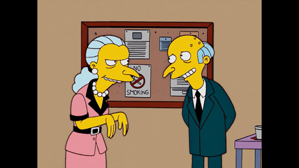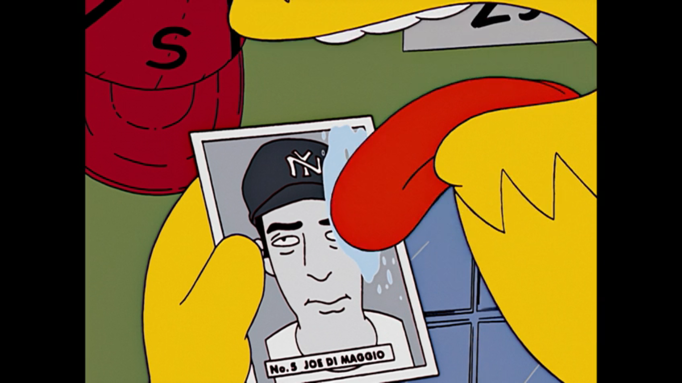 Burns (Shearer) hears the insults, but laughs startling Homer. He declares that Homer’s very obvious description of him describes “Cathy in personnel” to a tee. Who is this mystery woman? No time for that, for Burns is here to hand out Christmas bonuses. This feels familiar. The bonus this year? A five dollar voucher to the plant cafeteria which no one is happy with. I guess it’s better than the series premiere when they got nothing? Burns has something special for Bart though, I guess because he knows Homer has a son? They’ve obviously crossed paths many a time, but I don’t get the sense that he’s giving Bart a gift because of any of that. The gift is, as Burns puts it, a confectioner’s card of a current baseball player. The way he phrases it he clearly doesn’t place any value on this card, but it’s a Joe DiMaggio card and a pretty famous one in card collecting circles at that. Not that Homer is aware. Burns refers to DiMaggio as a rookie for the New York Nine and when Homer says the name in disbelief (likely because he knows that Joe DiMaggio has long since passed his rookie days) Burns confirms it’s him and adds, “It seems they’re now letting ethnics into the big leagues.” He then turns away from Homer and is surprised to see Cathy (Tress MacNeille), from personnel! She looks exactly like Burns and he asks her how things in personnel are she has a one word response for him: Excellent.