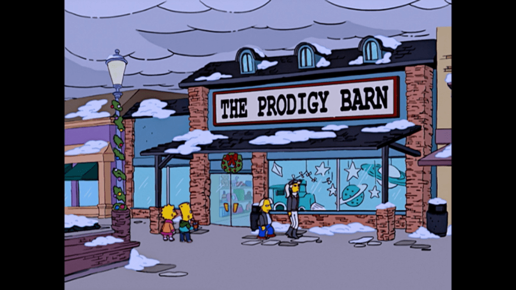 Homer is handing out wads of cash to everyone in the family to go buy Christmas presents with. And when they’re done, he also promises to get a glorious Christmas tree for the home. In fact, he declares it will be so large that its absence from the forest will cause mudslides and flooding. Everyone cheers this except Lisa. That’s some nice attention to detail. We cut to Bart and Lisa shopping together and Lisa has stumbled upon a toy store called The Prodigy Barn. Very quickly there’s a cameo of the rich happiest kid in the world and his mom from “Marge Be Not Proud,” though his hair is now blond instead of brown. Inside, Bart is playing a video game console clearly modeled after the original PlayStation as he’s blasting state capitols on a map of the United States. He soon realizes that this game is trying to teach him stuff and reacts angrily tossing the controller at the screen and declaring “That’ll teach you to teach me!”