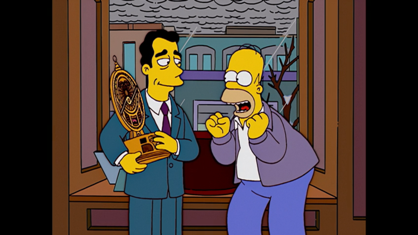 Homer may not know how valuable the card is, but he knows it’s worth something so he takes it to the only place in town he’d logically go: The Android’s Dungeon. Homer finds Comic Book Guy (Azaria) eating some nachos from his usual perch atop his stool and asks if he can get any money for the card? Comic Book Guy takes one look at it and nearly has a heart attack as he turns up his cash register and empties its contents onto the counter. He greedily snatches the card from Homer, but then immediately begins to fret because he got nacho cheese on it. He reasons the only solution is to deftly lick it off, which he does. Homer just grabs his armful of cash and walks off remarking “Freak,” under his breath. We don’t know how much Homer just got, but probably not a substantial amount? Most stores only keep so much money on-hand, though I suppose a business that buys and sells might have more than usual. Either way, he probably didn’t get full value since that’s a card worth tens of thousands of dollars, but at least he’s happy.