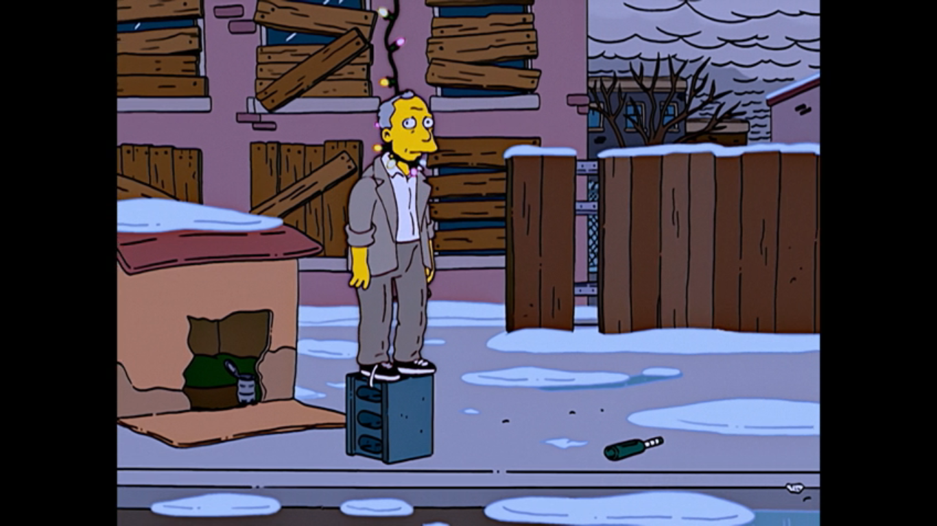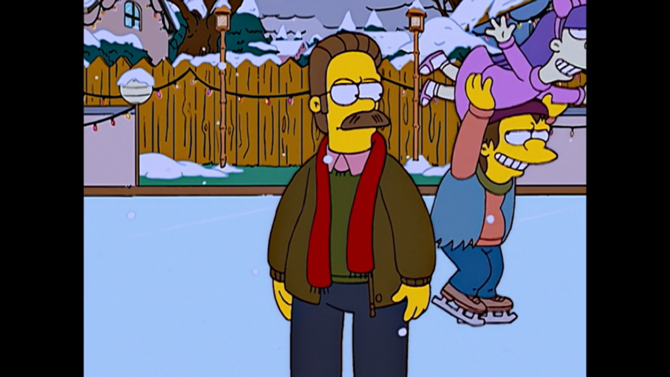 Ned is shown making his way to the Springfield Men’s Mission singing “Here comes sandwiches,” to the tune of “Here Comes Santa Claus.” He has a plate of cheese on bread for the homeless who dwell here, but because this is Season 15 Ned we have to get a little peak in his head as he refers to this as Boozy Bum Lane. In other words, this is the Ned who partakes in charity not because it’s right or just a nice thing to do, but because he just wants to get into Heaven. He’s shocked to find the place empty, so shocked he even spells out the H word (no, not that one). And he soon realizes that everyone is at Homer’s where they can rent skates for free (how did he come into possession of all these skates? Shut up, Joe, just go with it) no matter how gross and black their feet may be. Ned is frustrated and dismayed to hear Gil (Castellaneta) refer to Homer as the nicest guy in town. Nelson (Cartwright) is also there to deliver his customary “Ha! Ha!” and add a dash of “Your position has been usurped!” He also makes a couple more passes to rub it in even laughing “You’re sad at Christmas!” While he does he demonstrates some really fine tandem skating with Sherri or Terri. Sometimes a guy surprises you.