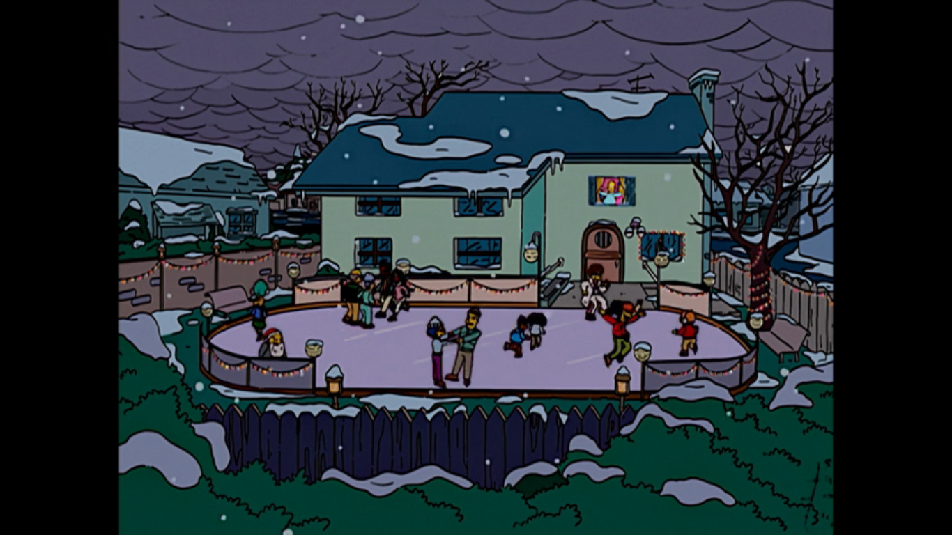 We return, yet again, to the Simpson master bedroom only now things are far less frosty. Marge is delighted in Homer’s transformation and he has come to view being unselfish as a natural high like hiking or paint thinner. And he’s not done! Homer then unveils to Marge his latest gift to the town: an ice skating rink in the Simpson backyard. How he built that without Marge’s knowledge is not specified. Similarly, how could he, the man who couldn’t afford a Christmas tree, manage to buy all of the materials needed for a rink? I should stop asking questions. It’s a hit though as numerous people are skating on it. Comic Book Guy demonstrates he’s pretty nimble for a man of his generous waist even though his leap results in a fall. A fall that splits his pants. With a declaration of “Activate cloaking device,” he ties his coat around his waist, only for that to rip too. Overcome with depression, he chooses to engage candy bar sadly.