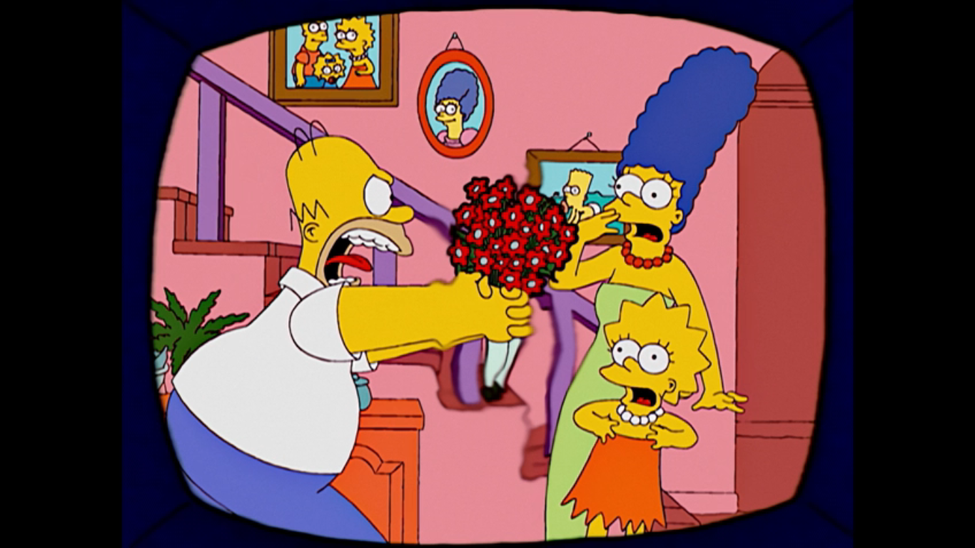After an act break, we return to the TV! Man, this episode has a lot of old Simpsons tropes between the bedroom scenes and the plot-advancing television spots. It’s the nightly news with Kent Brockman (Shearer) delivering a breaking news report on the nicest guy in town: Homer Simpson. He has to deliver it in his Brockman way though by first shocking and horrifying the viewer with the announcement that Santa Claus is dead! This gets a scream out of Bart and Lisa who are, strangely, the only ones watching the news in the house. Bart didn’t seem to believe in Santa way back in the first episode, but I guess he’s had a change of heart? Or maybe it’s just a part of him he can’t let go? This was all a clever setup by Brockman to declare that Santa might as well be dead, because Homer Simpson has stolen his spotlight. They then show a photo of Homer strangling Bart in front of Marge and Lisa, but it’s been digitally altered to replace Bart with an image of a bouquet of flowers.