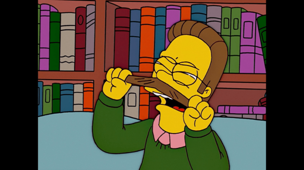 We then cut to the family at church where Ned and Homer are in charge of the collection plates, though they’re really more like baskets on poles. Homer gets to Burns who just deposits a coin into the basket so Homer jabs at him. He drops another coin in, but Homer is still not satisfied so he keeps jabbing him in the face. Burns finally relents by emptying his entire wallet into the basket, including his credit cards and eventually the wallet itself. He then angrily suggests that Homer take his blood too and pricks his finger, but only dust comes out which Burns acknowledges by saying “Yes, I’m old.” Ned happily empties his basket into a sack held by the Reverend Lovejoy (Shearer) who is only too happy to inform Ned that this week he came in a distant second to Homer who has a rather impressive haul. Homer announces he’s not looking for glory, he’s just trying to buy that stairway to Heaven Jesus sang about. When Ned corrects him that it was actually Led Zeppelin who sang that song, he just scoffs and tells him to get back to his bong, hippy! He and the reverend then smugly walk off leaving Ned to stew in anger. His kids come over and Todd asks him if he’s jealous of Homer with some shock in his voice. Ned confesses that he is a little jealous. To try and cheer him up, Rod confesses he’s jealous of girls because they get to wear dresses and Ned angrily responds with “One problem at a time, boy.” This was the era where Ned Flanders became a more bigoted Christian. I know some people don’t like this turn for Ned, but when a show is on for as long as The Simpsons characters are going to change with the times.