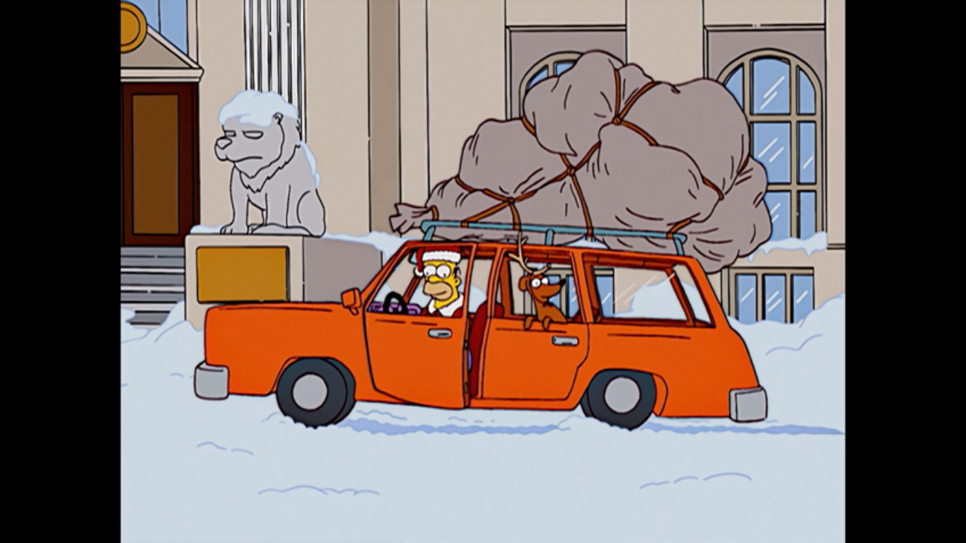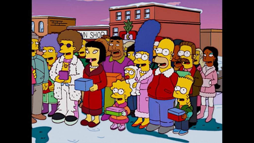 No one was paying attention to old Moe for they were busy launching into a rendition of “Hark! The Herald Angels Sing,” because we need to tie this back to Peanuts one more time. Moe actually gets to deliver the “Peace on Earth and mercy mild,” line so we see he’s not dead, just really, really, hurt. As the crowd sings, we cut back to the wrapped astrolabe on the roof of Homer’s car. We hear it say that today is the birth of Jesus, and also the birthday for singer Barbara Mandrell. Snake then steals it for good measure, a nice way to bring the whole story back around to the beginning. We fade out on the crowd singing. Merry Christmas!