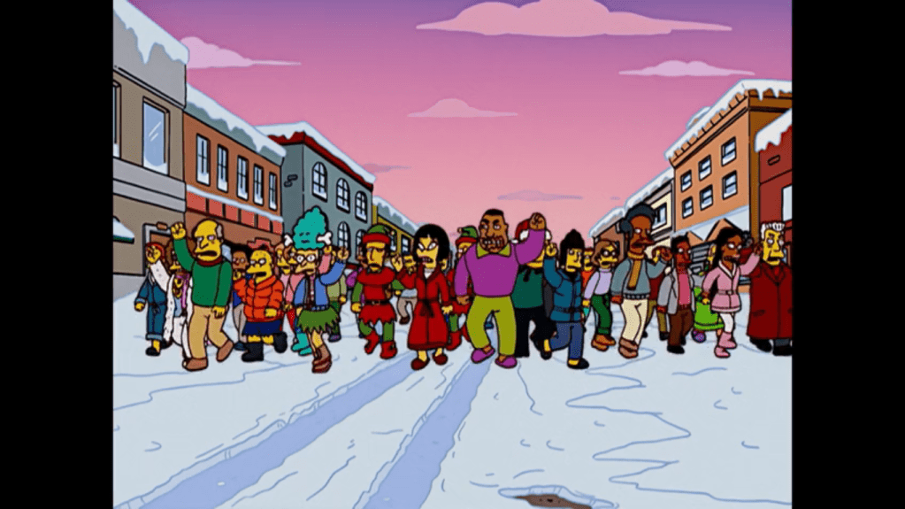 Back in the center of town, Ned is finishing up reading from the Bible, the same passage old Linus referenced in A Charlie Brown Christmas. Before he can finish though, Mayor Quimby (Castellaneta) buts in to say that Ned can’t pray on city property. Homer takes it from there, “Let’s just say that on this day, a million years ago, a dude was born who most of us think was magic, but others don’t, and that’s cool. But we’re probably right. Amen.” The crowd returns with an “Amen” as well, and I just love that summation by Homer. It sums up that Christian smugness so prevalent in American society since that’s the majority opinion.