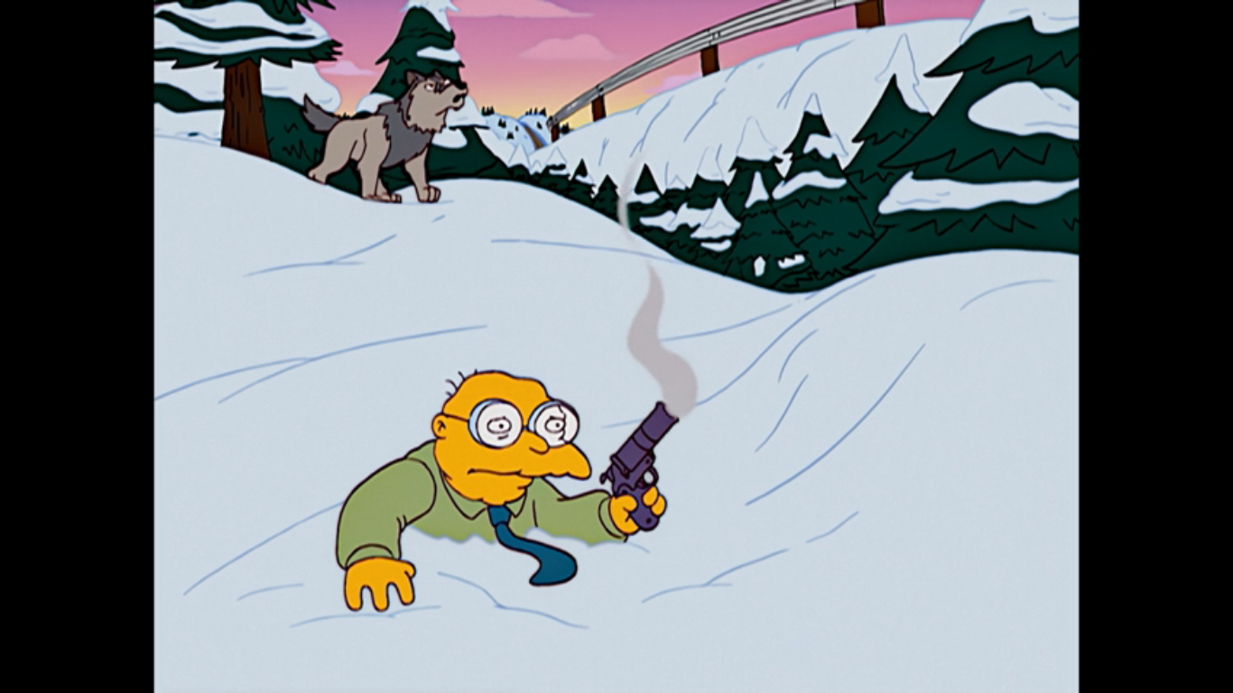 Now, it’s Homer’s turn to rise to Ned’s defense. He shouts out for everyone to wait and look to the sky for there is the Christmas they need. And in the sky high above Springfield is a brilliant, shining, star. Everyone is transfixed with Selma (Kavner) even declaring it a miracle. We cut abruptly to find out that it isn’t a star, but a flare fired by Hans Moleman (Castellaneta) who appears to have gone off the road and is stuck chest-deep in the snow. It’s his last flare too, but don’t worry, for rescue dogs have come to his aid! Oh, actually those are wolves and the McGrew-like Moleman is blind and confused and sure to die.