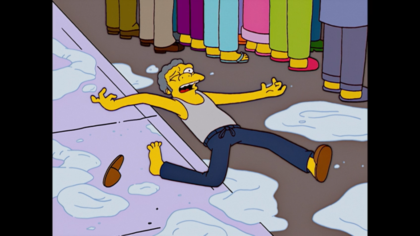 Homer then decides, with Ned’s help, to return all the gifts! As the two toss gifts to the mob, we get the expected animation of Santa’s Little Helper doing his Max impression as well. To sneak in an extra joke, we also get to see Professor Frink (Azaria) open his present and find it’s a brassiere (his choice of words), but in the spirit of Christmas, decides to make pretend that he has boobs. Bart is shown sharing his sentiments that this is a great Christmas and that not even Moe’s (Azaria) annual suicide attempt can bring him down. We then cut to Moe on top of City Hall threatening to jump and no one taking him seriously. Moe vows to jump and that they’ll all be sorry, but then laughs and confesses he’s not going to do it, but slips and falls anyway.