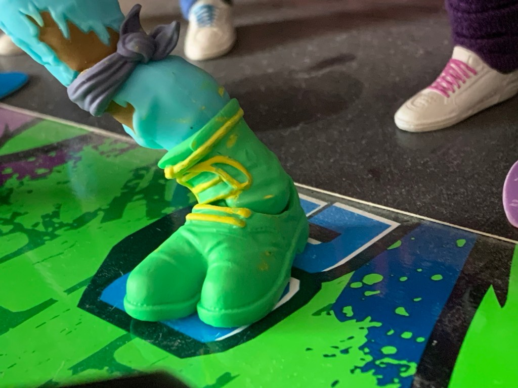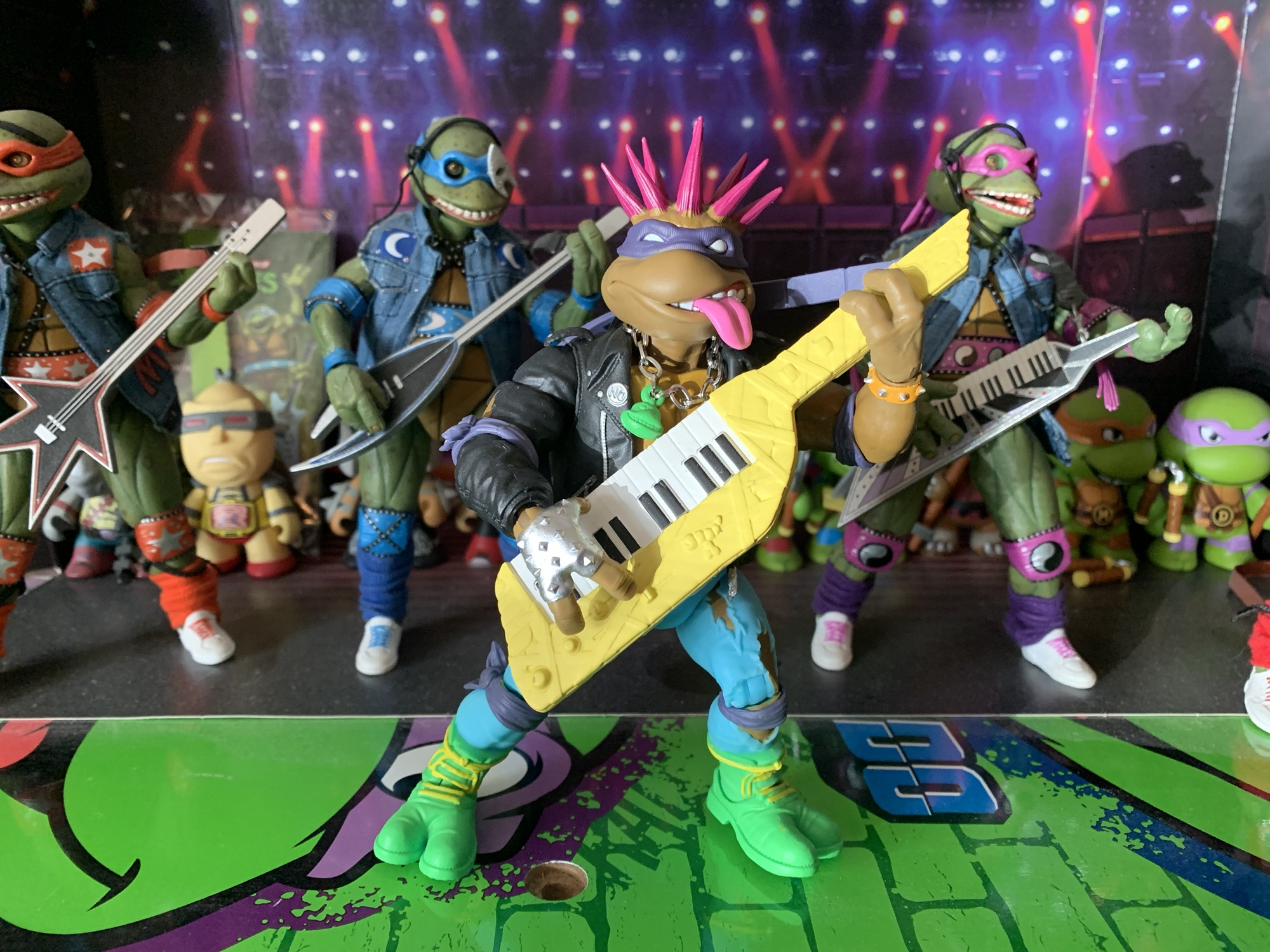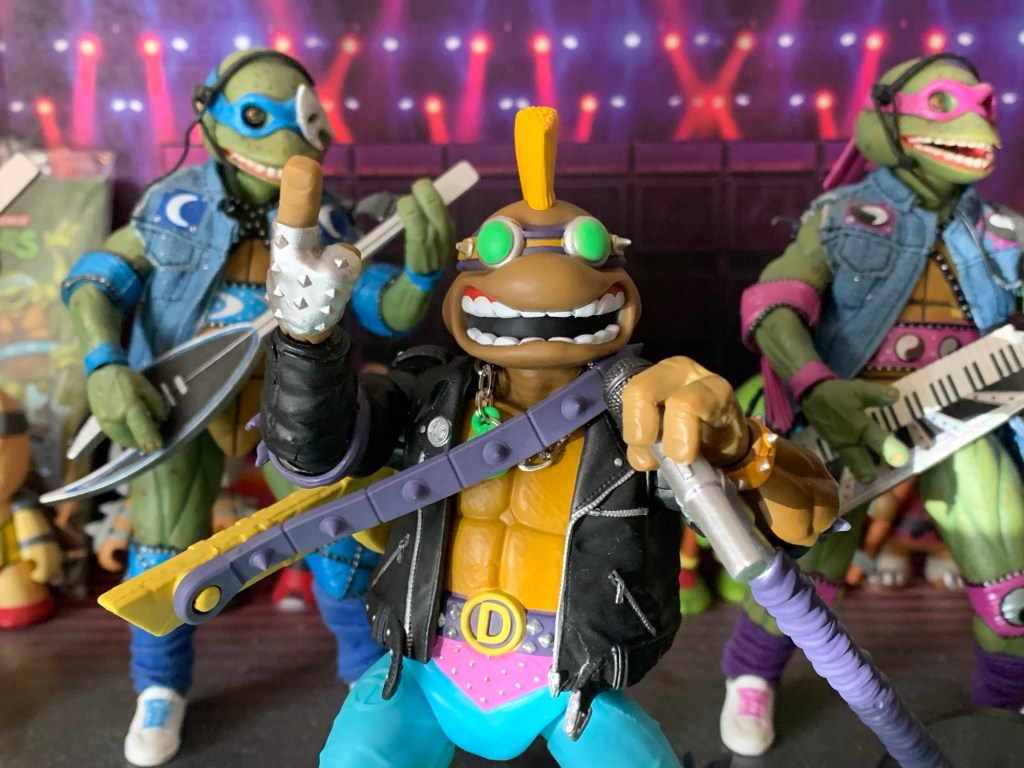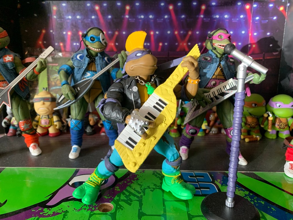 That’s not the only reason why this design is so amusing to me though. The other is the chosen instrument: the keytar. I don’t really know if the keytar truly belongs to any genre of music, but I know it does not belong to punk. I get it. Leo and Raph both came with guitars and while they could have given Don a bass, a bass guitar isn’t exactly visually distinct from a guitar. Especially since the guitars included with the others aren’t accurate to the actual instrument when it comes to string count. I wish he came with a drum kit, but maybe Playmates saw that as too expensive back in the day? And sticking a lone drum around his neck like the Little Drummer Boy would have looked just as ridiculous as a punker with a keytar.