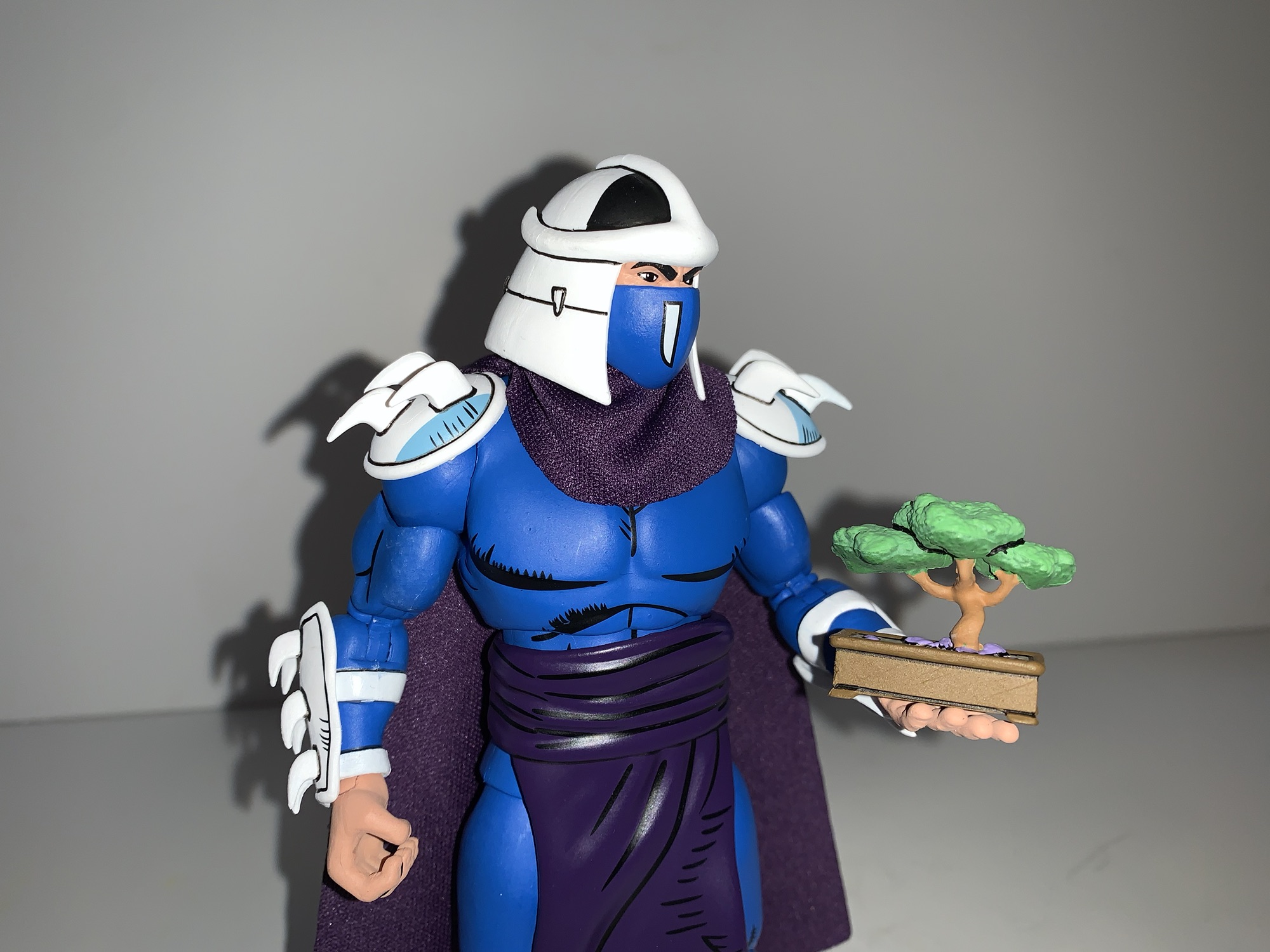 The rest of the accessories are a mix of obvious and perhaps not so obvious. For hands, Shredder has a set of fists, open, gripping, and fists with his signature blades on them. The blades kind of come and go in the comics and it was pretty important to have an array of hands without them. Still, I do wish we got a set of open and gripping hands with the blades in place too. For the gripping hands, Shredder has this big poleaxe of sorts. It basically looks like a bo staff topped with a bladed head that’s serrated on one side while the other side almost looks like a giant bottle opener. It’s cool though and I like the size. It’s also pulled right from the comic and if this Shredder was only going to have one weapon then they picked the right one. Shredder also has his little banzai tree which, sort of like Slash from the cartoon and his “binky,” is an important item to Shredder so it’s a fun thing to have even if it’s not the most exciting. It’s really well painted and I might just keep it on my desk.