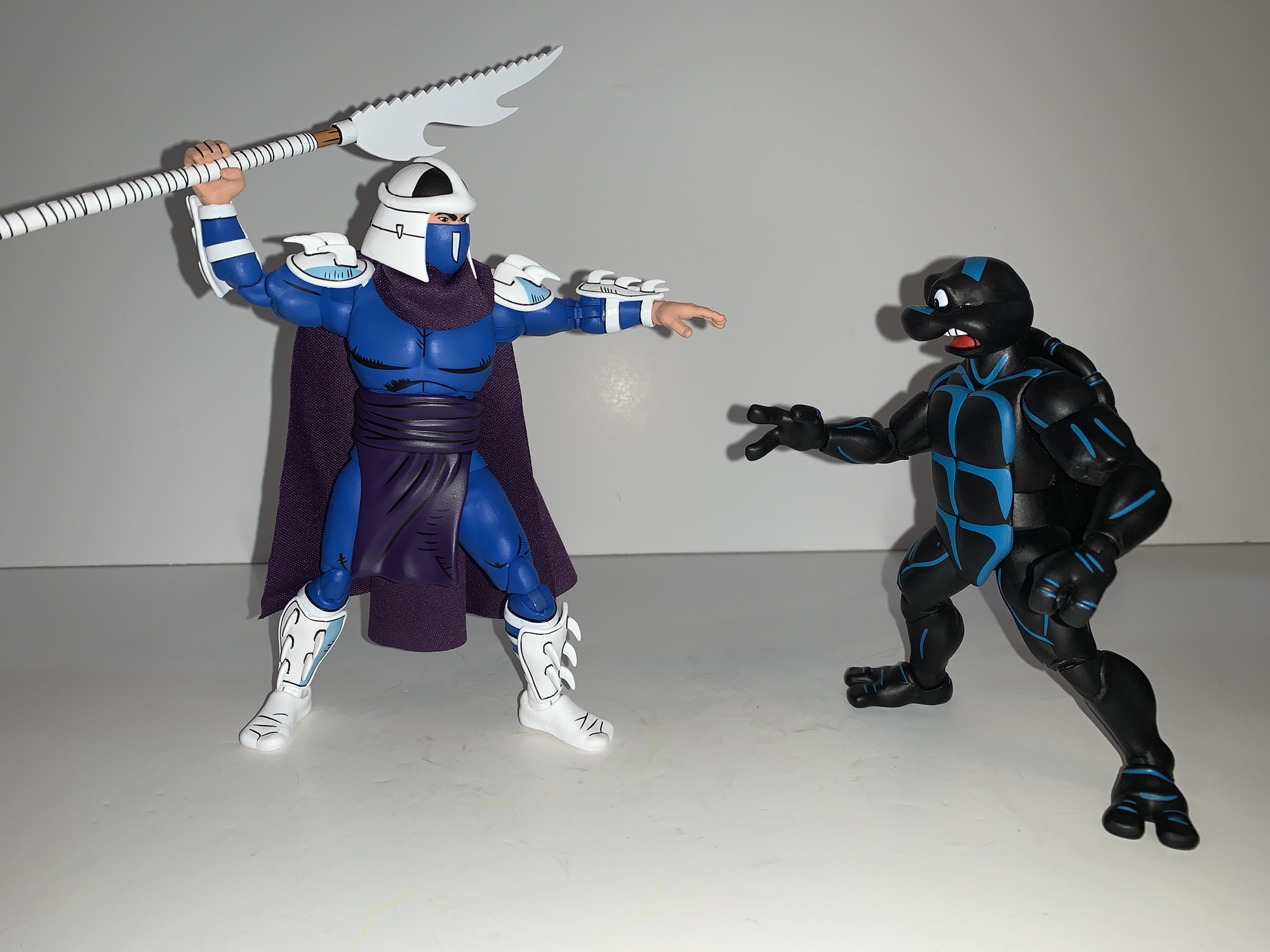 I have detailed in several of these figure reviews that I wasn’t a regular reader of the Archie run of TMNT. I should rectify that some day, but I had honestly forgotten what Shredder looked like in those books. I mostly saw those issues via the covers and covers alone and on those he was often depicted as he was in the cartoon. In the books themselves, Shredder was usually colored with a blue body suit and purple cape. The metallic portions of his traditional outfit was colored white with blue highlights. This isn’t that unusual as if you take a look at just about any depiction of Wolverine in a comic his claws are often white. We know they’re steel and probably wouldn’t be white in reality, but that’s comic book coloring logic. The cartoon went with gray for Shredder with minimal shading. The toy went with blue. Shredder was all over the place, but this white and blue look was certainly unique and something about it works. It’s classy!