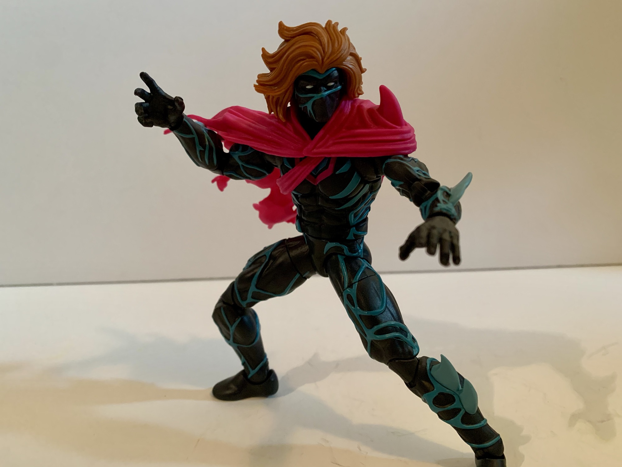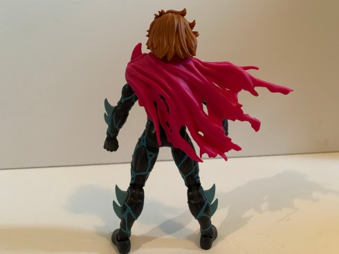 Since this is an all new body you may wonder if it has some articulation surprises. And the answer there would be, “Not really.” They had to make new molds to produce this figure, but I bet they just took an existing digital sculpt and then added the details to it before cutting steel. As a result, Kaine feels like a lot of Marvel Legends. He has the hinged ball neck, ball hinged shoulders, butterfly joints, bicep, double-elbows, swivel and hinge wrists, ab crunch, waist twist, ball hips, thigh cuts, double knees, and ankles that hinge and rock. Range at these joints is also all typical Marvel Legends stuff. He can almost do splits, kick forward 90 degrees, and the ab crunch works well enough. Where this figure is limited is the head and that left shoulder. The combination of the big hair and the plastic cape really lockdown the head. He can turn to the side a bit, look down, and barely look up. The left shoulder is also restricted by that cape, but really only in a sense that it can’t rotate all the way around. It does a decent enough job of getting out of the way with most movement and once you’ve settled on a position you can just reposition the cape. It’s not nearly as bad as it looks like it would be, though I’m sure there will be people getting custom soft goods capes for this guy.