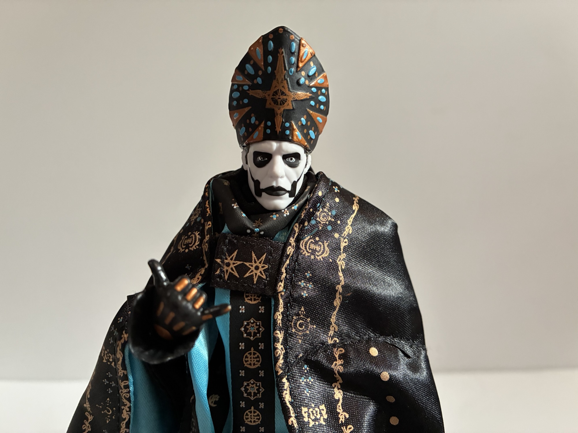 Papa IV took over for Papa III and is the son of Papa Nihil who fronted the band back in the 70s when only three songs were produced: Kiss the Go-Goat, Mary on a Cross, and The Future is a Foreign Land. Like his predecessors, Papa IV tends to take the stage in a somewhat flamboyant suit his face a mask of black and white, but when the situation calls for it he’s known for dawning wings or his full vestments as the leader of the clergy. Super7 has produced figures of the three Papas to come before him (they have not done Papa Nihil) so it was hardly a surprise when this figure went up for preorder last year. I have all of the predecessors, but I only reviewed the first one as they’re fairly similar. This one is perhaps the most different one yet though so I figured, why not? Plus it’s certainly topical.