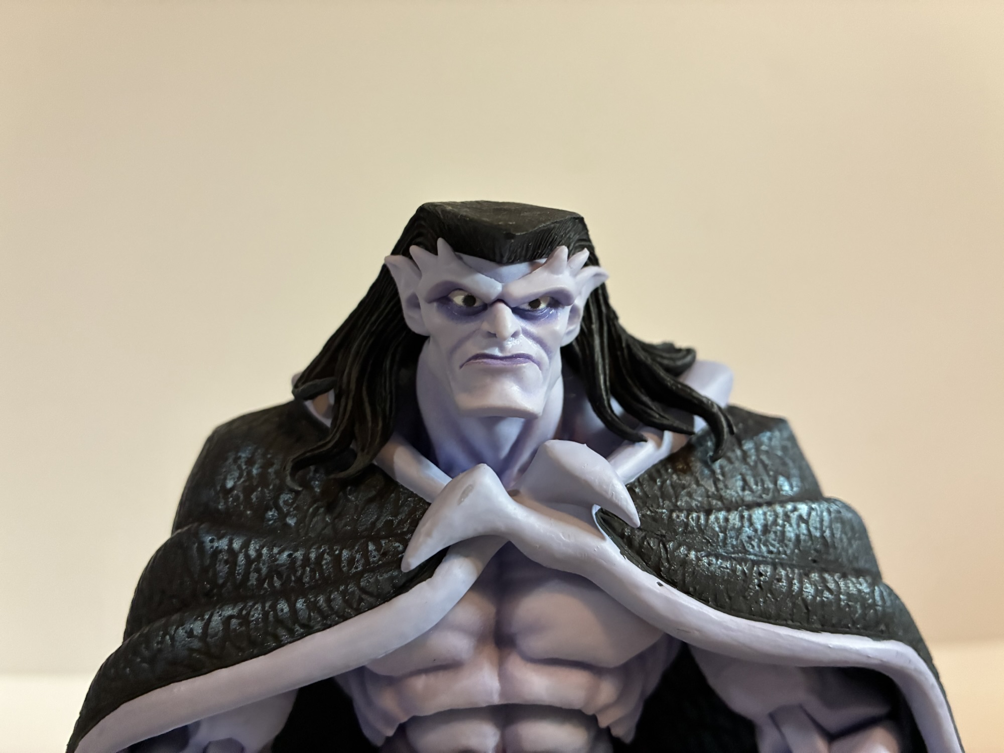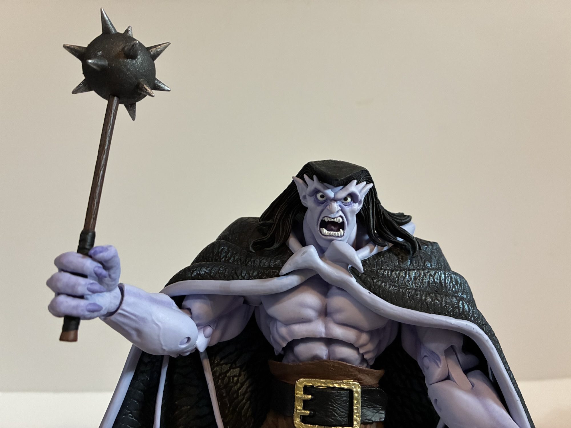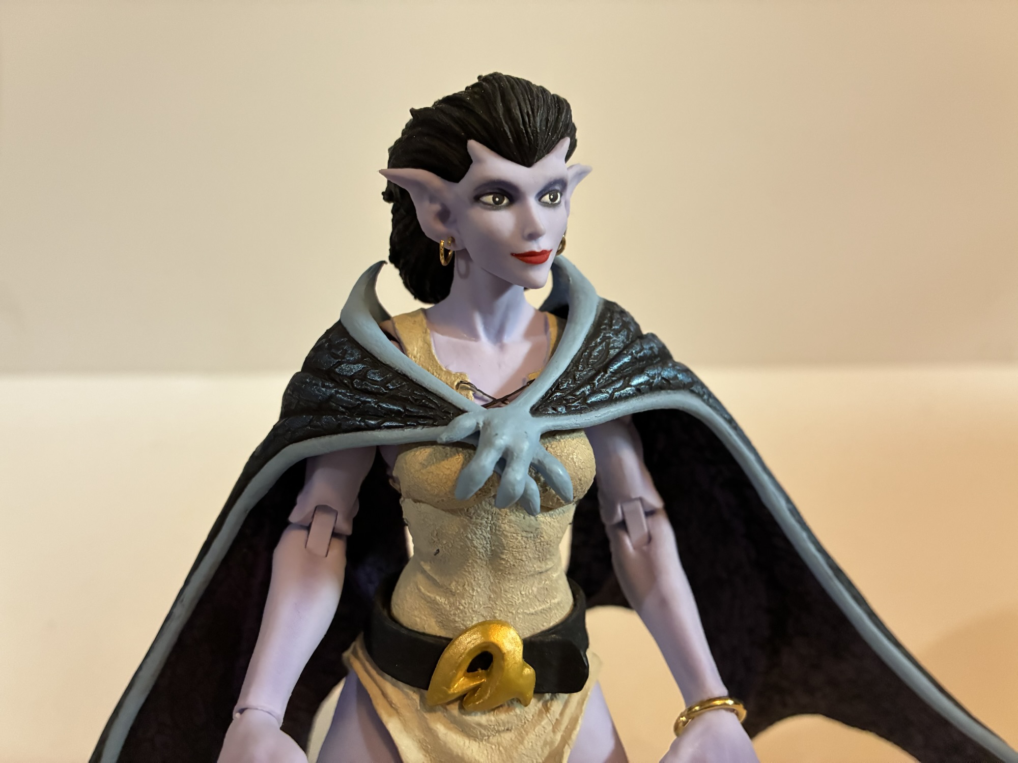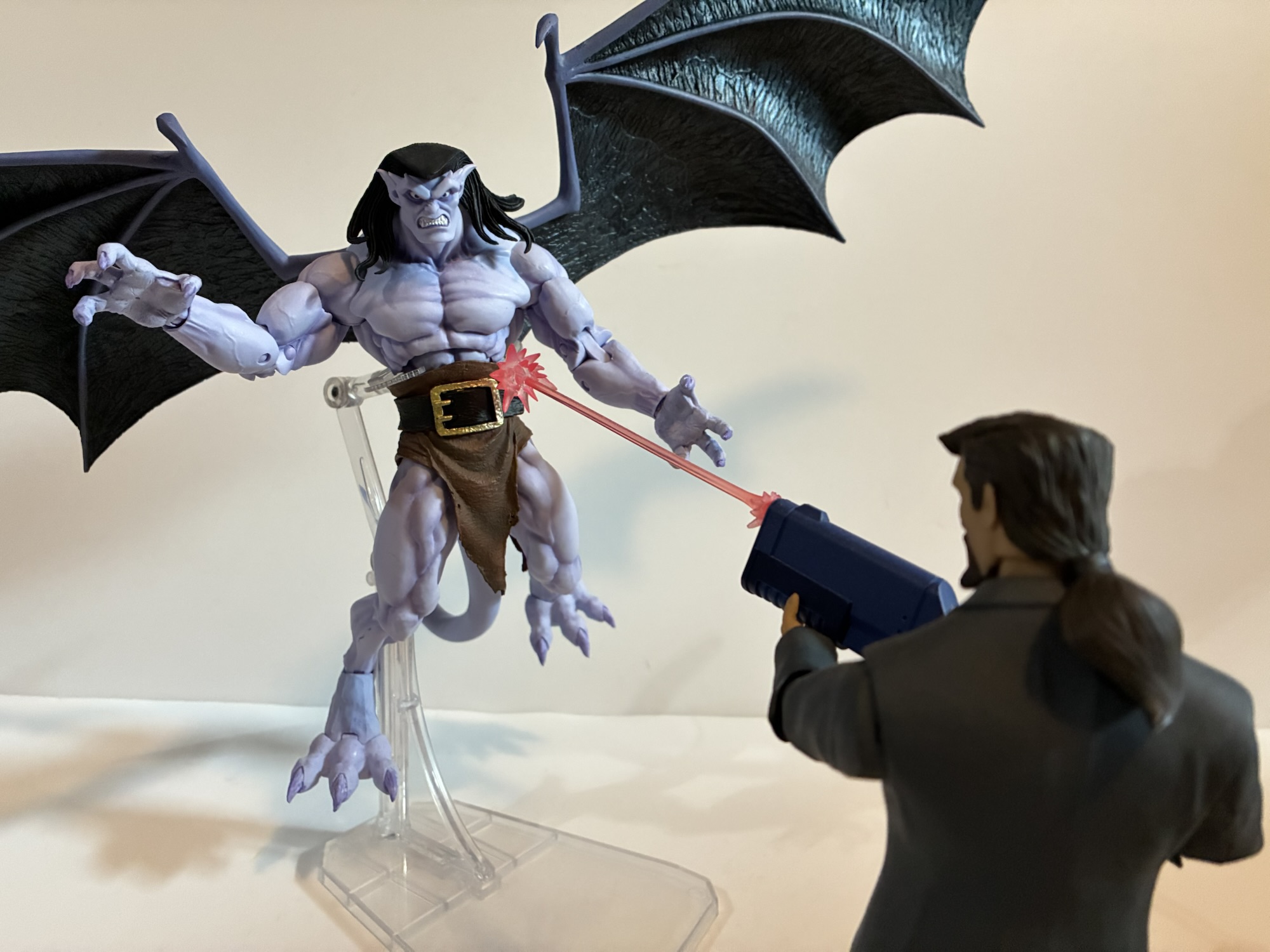 As for the figures themself, they’re exactly the same as before. Same pros, same cons. Goliath is hard to pose, but with his tail he’s not that hard to stand at least. The caped wings mean his arms can’t do much though so he’s just going to stand there. The open wings work fine as well, provided you have them. Demona is also the same. Her caped wings really don’t want to plug into her back, or rather, the right peg doesn’t want to. I can probably get it in if I heat it up, but I have yet to try. I didn’t have any issues with the other caped wings and my first release. Demona is still really frustrating though because she’s basically always looking down slightly. I wish NECA had given her a second hair sculpt with her ponytail up or articulated or something. The angle of her face just drives me crazy. She’s also hard to stand because female gargoyles in the show keep their knees straight and stand on their toes while the males bend at the knees, making weight distribution simpler. A stand for the women would have been nice. These figures also really needed a neck joint or alternate portraits that allowed them to look forward while flying gliding parallel with the ground. NECA got some great sculpts out of Djordje Djokovic, but they really needed their engineers to do something more with them. They probably thought they were doing him a favor by not cutting them up more, but really they did him a disservice since these things just don’t pose well.