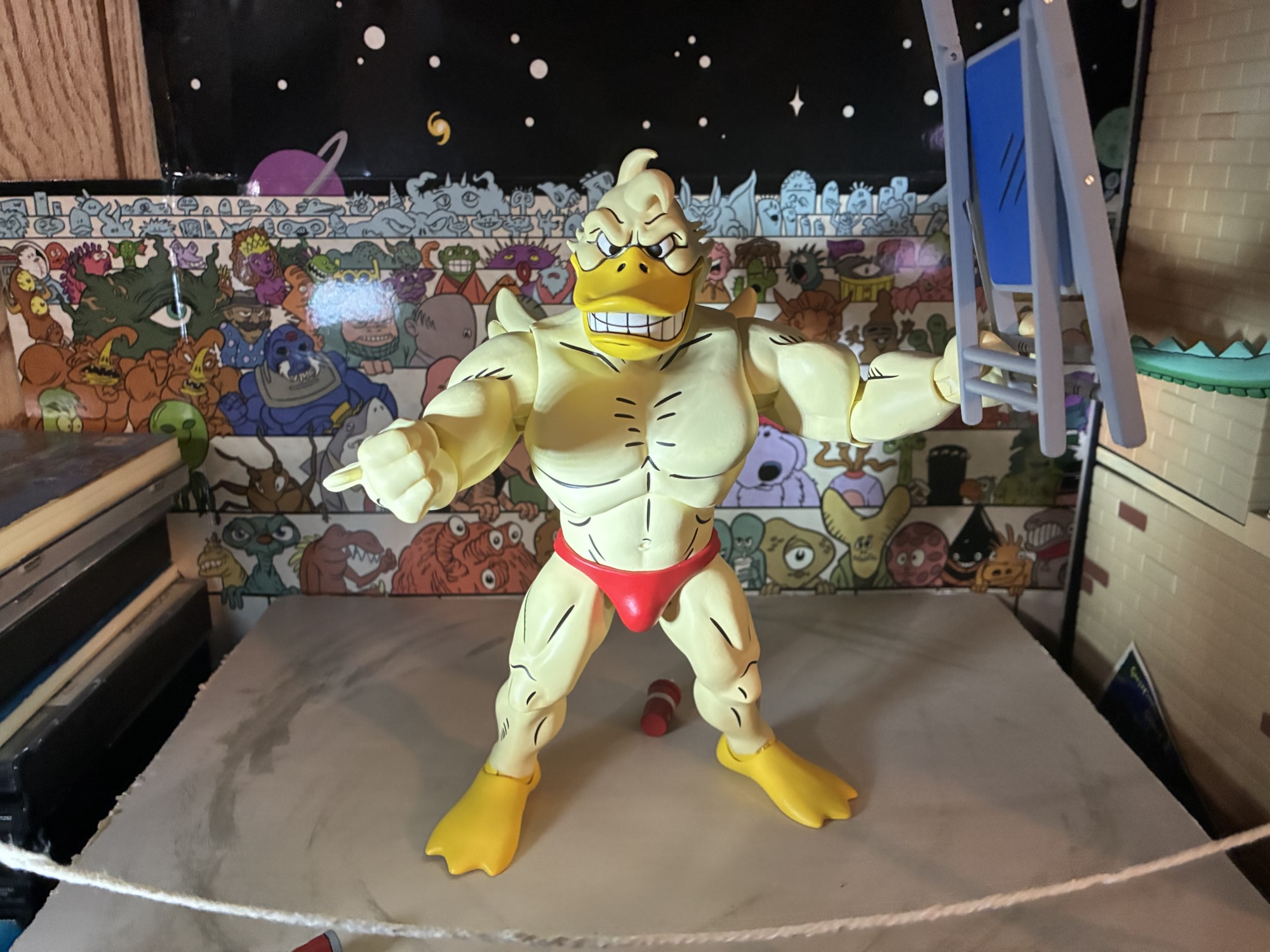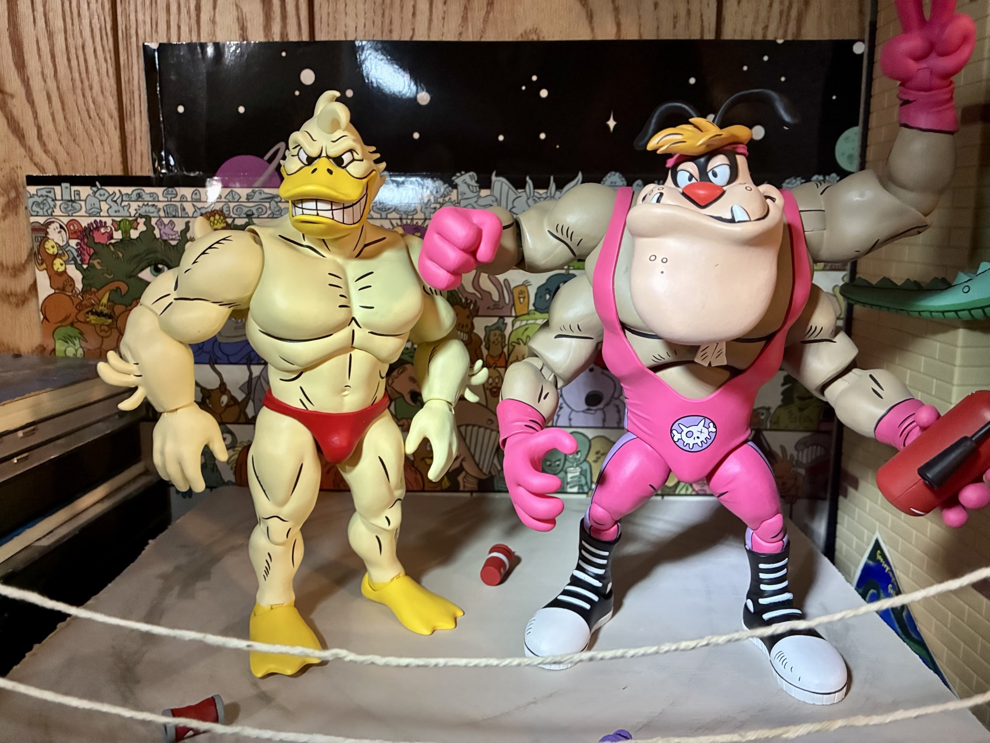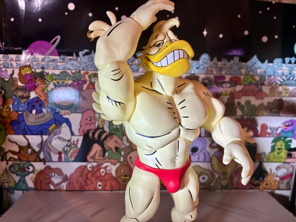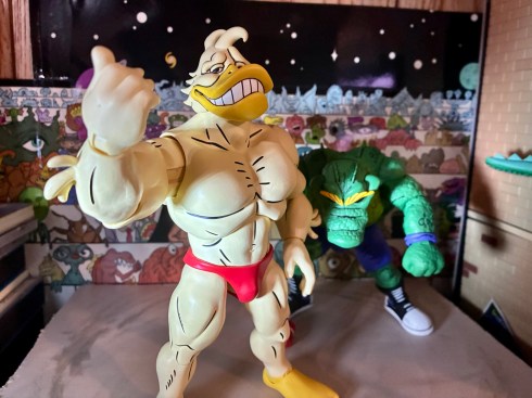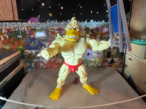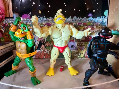 NECA’s TMNT Adventures line of action figures has been committed to giving fans basically everyone associated with the fictional Stump Wrestling. We have the turtles, Leatherhead, and Cryin’ Houn’, and now we have Ace Duck. This version of Ace is quite different from his Playmates counterpart. The only things the two share are the fact that they’re both ducks and they both have wings. While the original Ace is of average build for a human, this duck is massive. The phrase beefcake comes to mind, but also feels inappropriate for the massive mallard since he’s not a mammal. He’s a big boy and would have fit right in with the WWF of the early 90s. Even the whole duck thing probably could have worked in the promotion that introduced the Gobbledy Gooker. He also has a bit of a Buddy Rogers thing going on as he’s kind of a pretty boy. Part of me wonders if this design was influenced by Daffy Duck’s foil in the short Muscle Tussle because even the trunks are the same to go along with the physique. As a character, he’s neither friend nor foe to the turtles and even though he’s depicted as champion, he sure seems to lose a lot.
