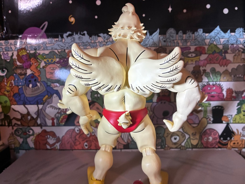 Ace Duck stands right around the 7″ mark and as high as 7.25″ to the top of the curl of feathers on his head. I’m pretty sure the first impression most are likely to have when looking at this figure is that he sure is bulgy, in more ways than one. He is jacked as his shoulders are quite broad and his chest is puffed out like a man (or duck) of such musculature would be. He’s also quite bulgy down…there. It’s quite the comical look when compared with the old Ace and borders on ridiculous, but I mean that in a good way. Since this is just a big duck in a Speedo, there’s not much being asked of the paint department. He’s a pale yellow all over save for his beak and his feet, which are a light orange. There’s plenty of black linework on the figure to highlight the musculature and some of the feathers. He has a set of tiny wings on his back which are barely visible from the front. I guess he skips wing day when in the gym. The only other embellishments on the sculpt are the little feathers on his forearms.