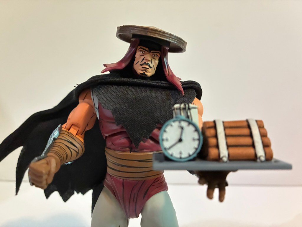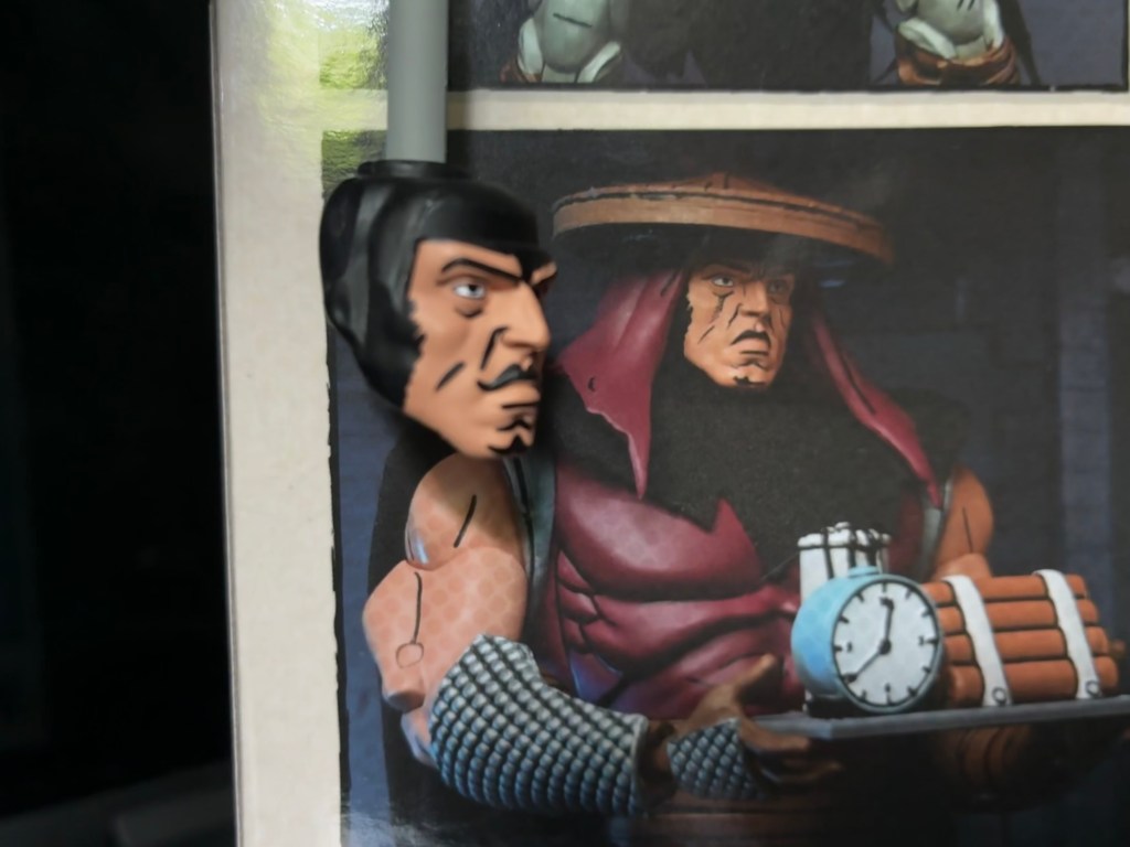 The Elite Assassin comes with a fair amount of weapons and other assorted parts to do some assassinating. The hands available include sets of fists, gripping, chop, and open/style-posed hands. He also has an alternate portrait with no faceguard. According to the box, the face is supposed to be a clean-shaven face and there’s some shading applied to the lips, but some wires were crossed at the factory and the lip shading turned into a mustache. I’ll never use it so I don’t care, but it is kind of funny. For weapons, we have a short sword, a handheld sickle, a longer sword with a ball and chain attached to the hilt, and everyone’s favorite weapon, a pair of gray sticks. These guys may have been drawn with such weapons in a comic somewhere, but I don’t think it’s something we really need. He also has a time bomb which I’m sure is from the comics and it’s well sculpted and painted. The bladed weapons are all silver with some blue applied and it looks nice, though different from how they do metal with the turtles. For some reason the Foot get silver and the turtles get white. Makes sense to me!