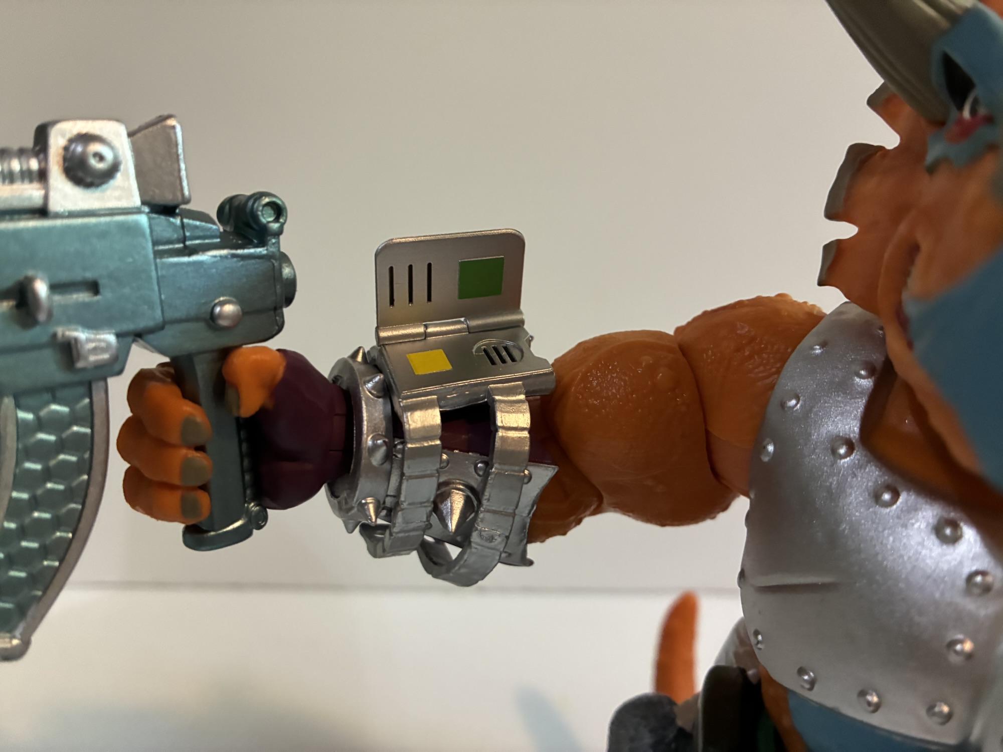 This figure is a glorified 5 POA figure. You will get rotation at the head, shoulders, wrists, and waist. The hips articulation is only so useful without knee articulation and that’s a shame. A ball-joint at the waist would have been nice and another joint in the diaphragm too. The design of the figure seems accommodating for such with the chest armor and the divided abdomen thanks to the blue coloring. Super7 opted not to cut it up though which would be defensible if we were getting better articulation out of the joints already present. The head being just a swivel is pretty terrible too. The NECA Triceraton is a very similar sculpt and that guy can look straight up. There’s really no excuse for what’s present.