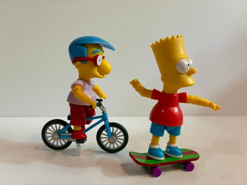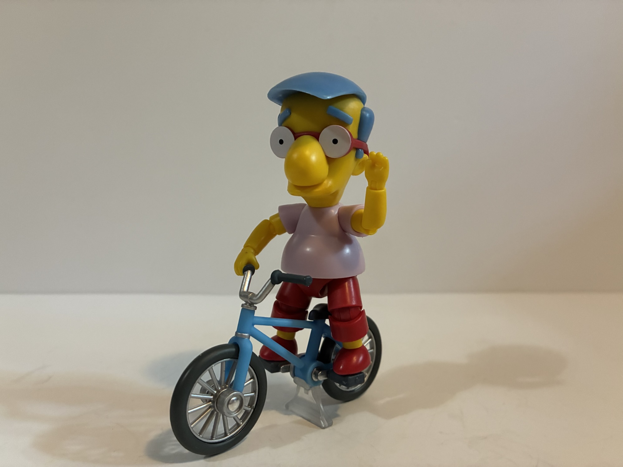 The last figure of Wave 3 is the little wiener nobody likes: Milhouse. I kid, of course, as I do like this figure which comes with perhaps the most ambitious accessory in the line yet: a bicycle. It would have been a lot cheaper to just give him an issue of Biclops, though it also would have been funnier to actually give him Lisa’s bike. Milhouse looks great though, but suffers from the child scaling like Bart and Lisa. His articulation is essentially the same as Bart and he can sit on the bike fairly convincingly. The bike has a stand, though it can still be tricky to get Milhouse properly balanced on it. The one difference with Bart that’s a bit odd is Jakks sculpted his knee articulation into his shorts rather than have it begin just past them. I suppose his shorts are traditionally longer than Bart’s, but it does look a bit weird. It’s also extra noticeable since he needs to bend his knees to ride his bike. That aside, he does look good and I think he turned out better than Bart and Lisa.