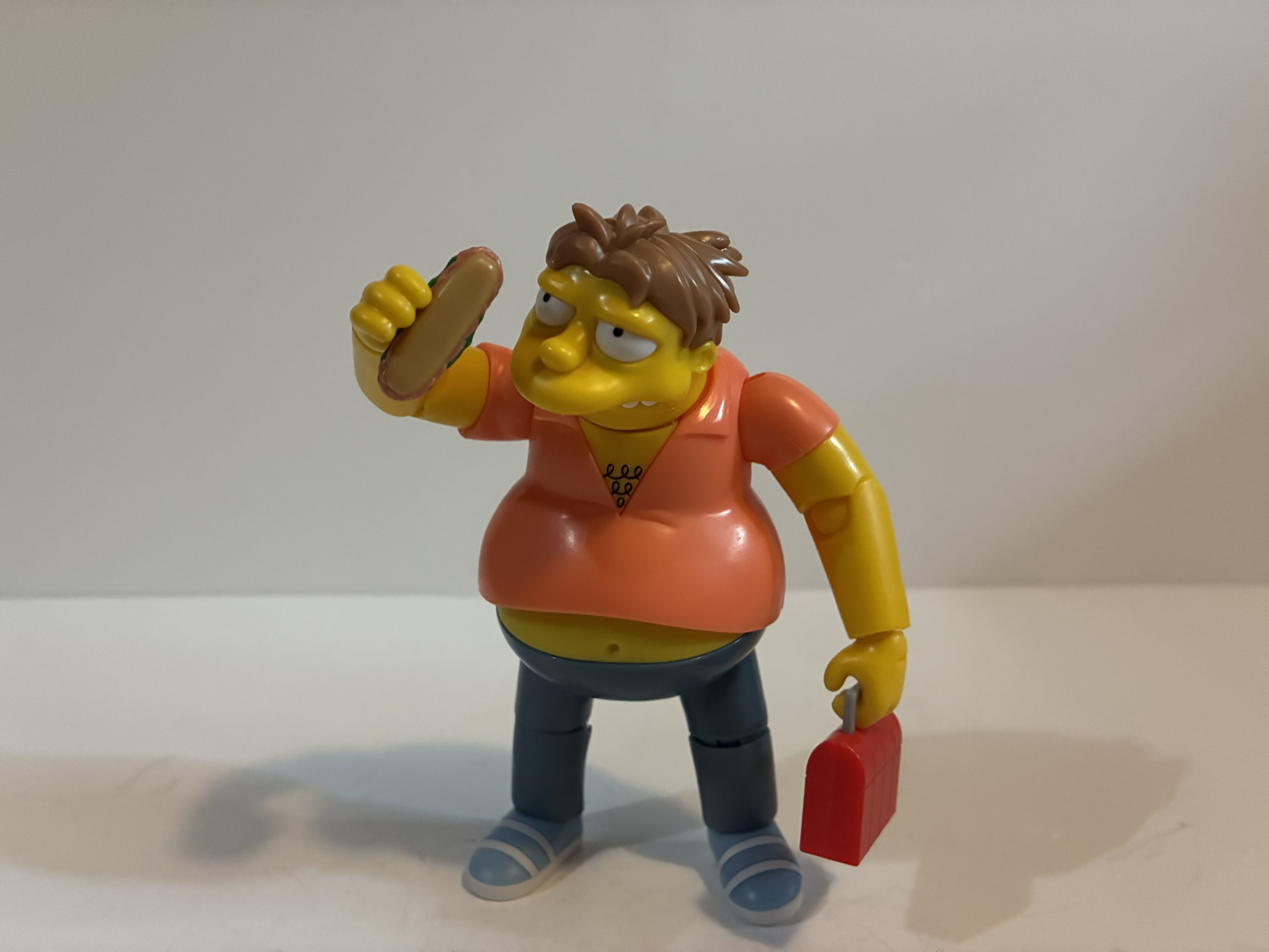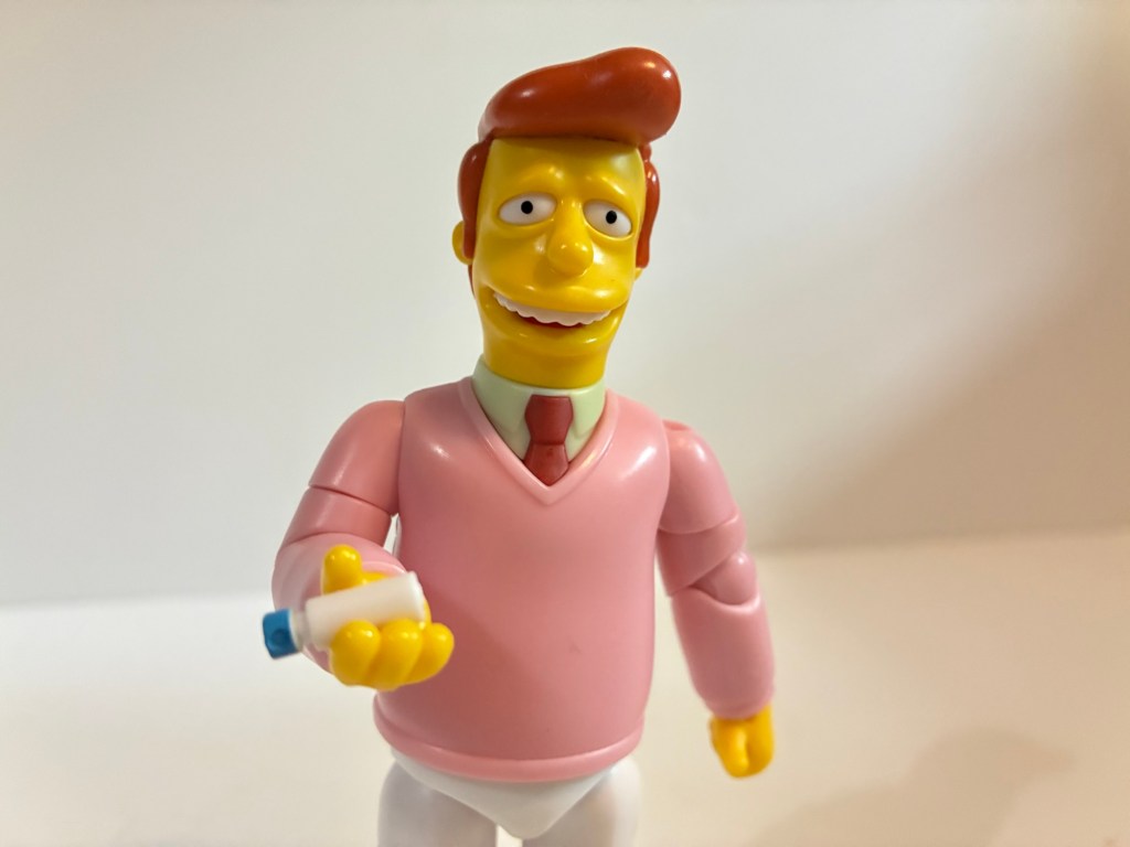 Bart’s teach, Mrs. Krabappel, finds herself among the characters of Wave 5. Like Lenny, she’s a bit off-model as she has a head that’s tough to render in three dimensions. Her eyes are off and it throws off the look of her as they’re too narrow and elongated. A half-lidded approach might have served her well and some bag lines under the eyes. She’s a little too happy and glowing for the downtrodden teacher. She also suffers from the same issue as Marge where her plastic skirt hinders any articulation she may have at the waist and below. Her accessories are a ruler and an eraser, which I guess is fine. I honestly would have been okay with a repeat of Lenny’s coffee mug or her picture of Woodrow. There’s no paint on either accessory so they don’t look great and you can barely tell the ruler is sculpted. She can hold them though so I guess that works.