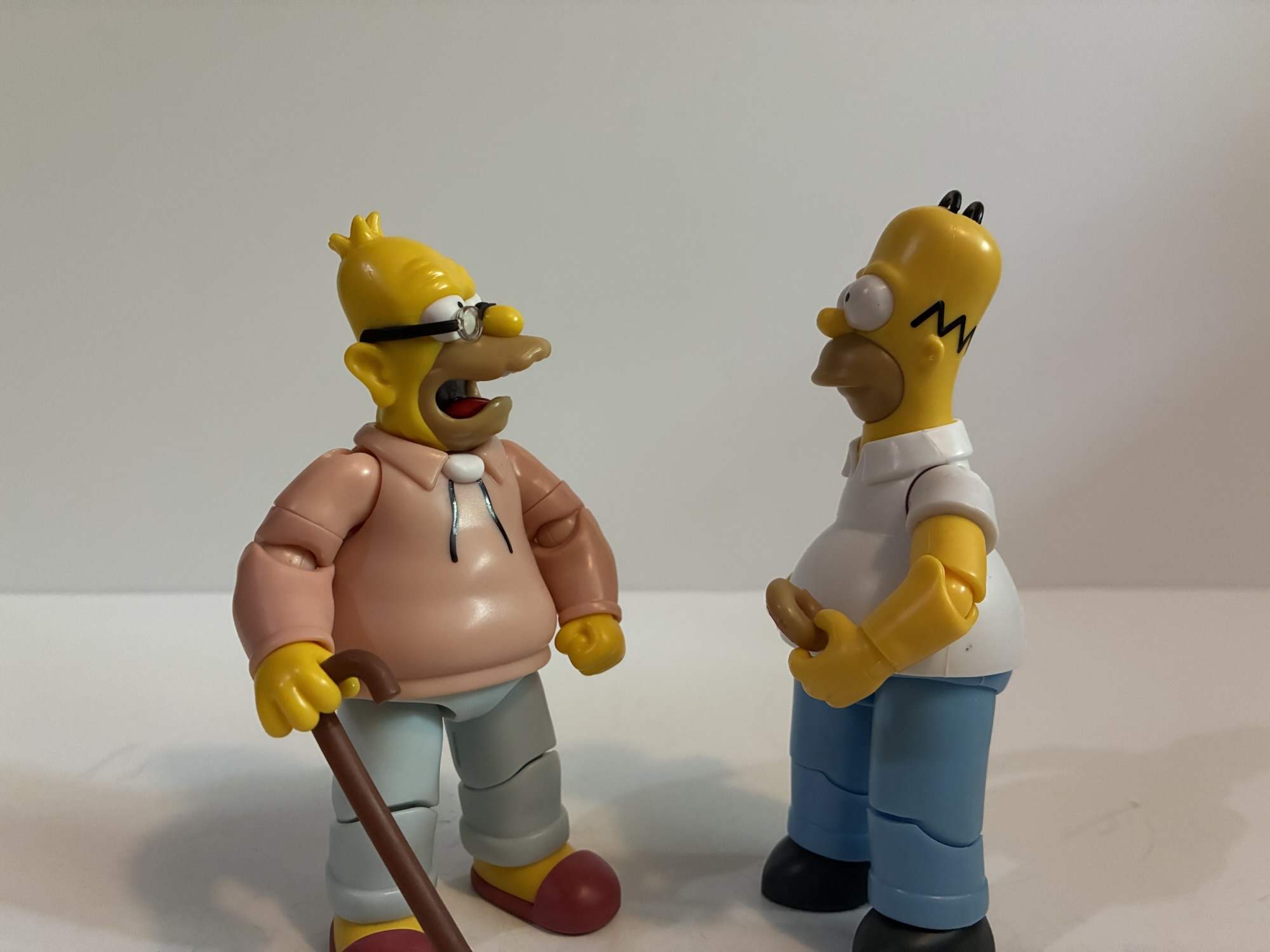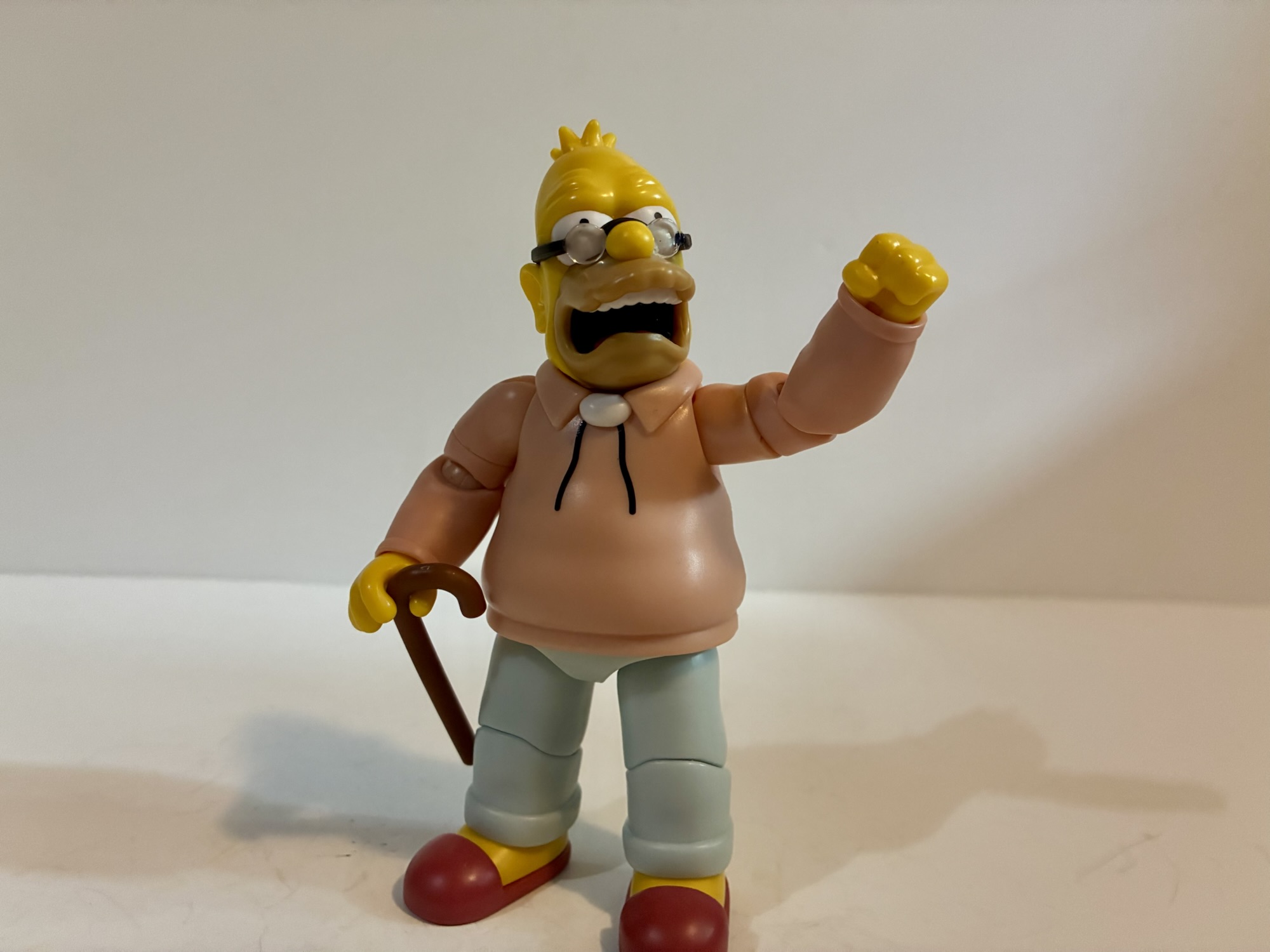 Wave 5 is where we’re getting some more side characters, though I would say it’s headlined by the inclusion of Abe “Grandpa” Simpson. This is where Jakks seems to be taking the portrait criticism to heart as Abe appears to be clearly modeled after the “Old man yells at cloud,” meme. I just find it ironic that they took this approach with a character who would have looked good with a dead-eyed stare. Still, I do like it though Abe’s head looks a little fat to me. The forehead area doesn’t have as dramatic a slope to it so he’s a bit off-model. It’s almost like a more Saturday morning approach to the character. The sculpt of his shirt looks nice though and his bolo tie is painted. His glasses are also clear plastic unlike Milhouse who has his eyes painted onto the lenses. The eyeglasses are too thick, a frequent issue for toy manufacturers, as well. His lone accessory is a cane and that suits him. If I am allowed to be pedantic, and Simpsons fans are known for such, Jakks did screw up by making his left hand the fisted hand and the right the gripping hand if they wanted to properly match the Old man yells at cloud image. I’ll let it slide though.
