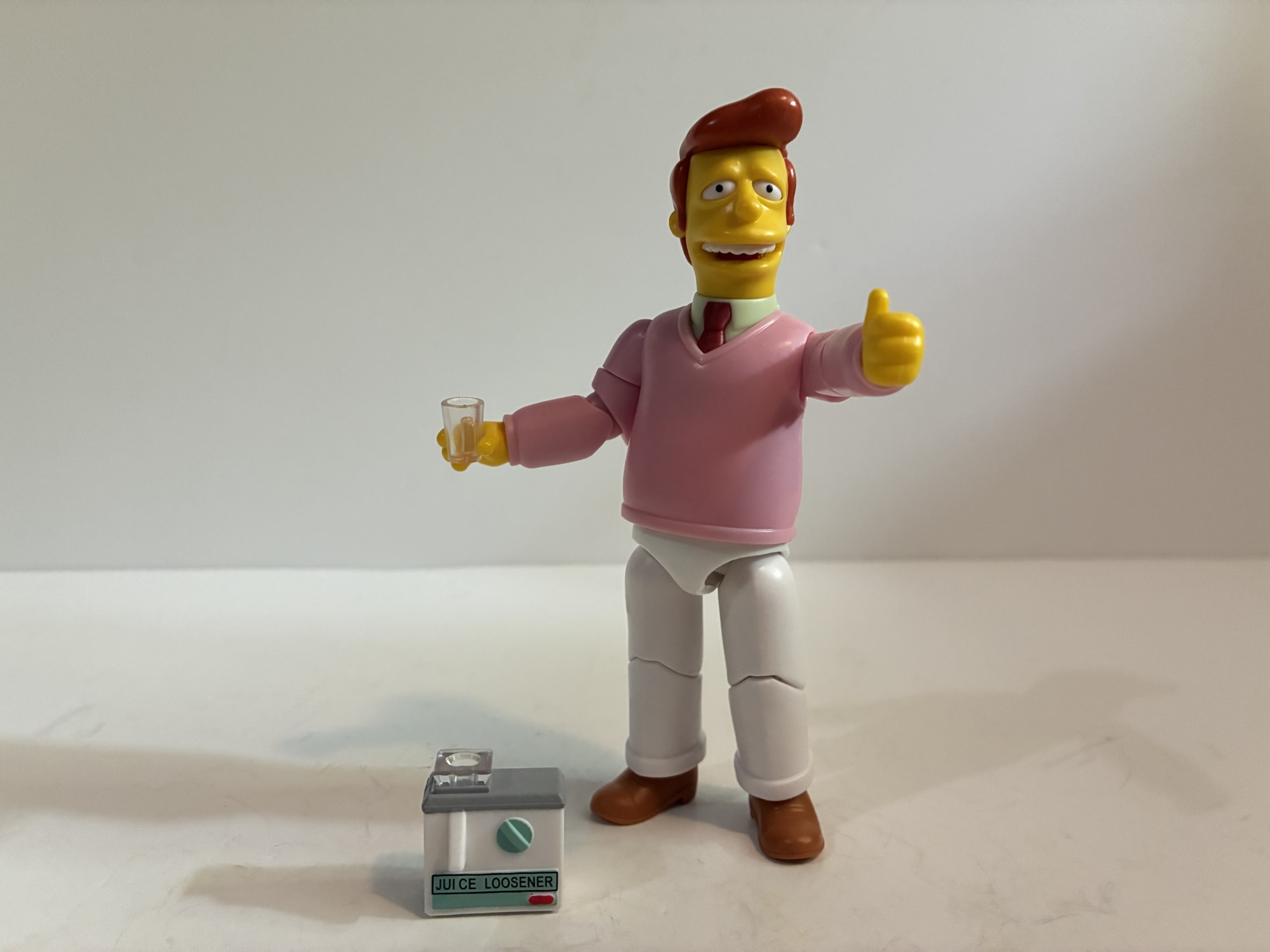 The last figure we’re going to take a look at is everyone’s favorite aquatic lifeform enthusiast, Troy McClure. You may remember him from such toy lines as The World of Springfield and Super7 ReAction! He’s depicted in his traditional look of pink sweater, red tie, and white pants. He has a nice, toothy, grin and I like that Jakks did include some bags under the eyes for old Troy, though some crow’s feet would have helped too. The head is maybe a tad undersized as it looks a bit off-model to me. I’m also surprised they went with an open mouth instead of just his smile, but I don’t mind as it makes him look like he’s in mid sentence. They also didn’t give him a microphone which surprised me and instead he has his breath spray from the episode “A Fish Called Selma.” I had to look at the package to figure out what it was as it looks more like a bottle with a screw top. His other accessory is pretty great though: The Juice Loosener. As seen in the episode “Marge in Chains,” the Juice Loosener is a juicer with horrible efficiency as illustrated by the included glass with an orange, circular, sticker on the bottom to show how much juice one can expect to get from an entire bag of oranges. It’s pretty great, and since Troy has a thumb’s up gesture for his left hand, he can hold the glass in his right (FYI: not an easy fit) and enthusiastically gesture with his left!